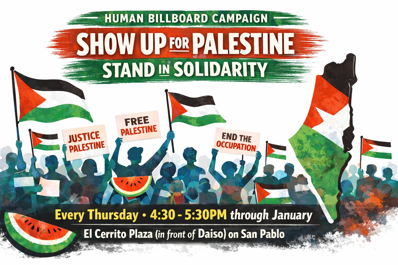 Every Thursday, we gather in front of El Cerrito Plaza to stand together in solidarity with Palestine. This is a Human Billboard action- visible, and rooted in our shared vision for a Free Palestine. We hold signs, we hold space, pass out information and we remind our neighbors that there is NO CEASEFIRE in GAZA.