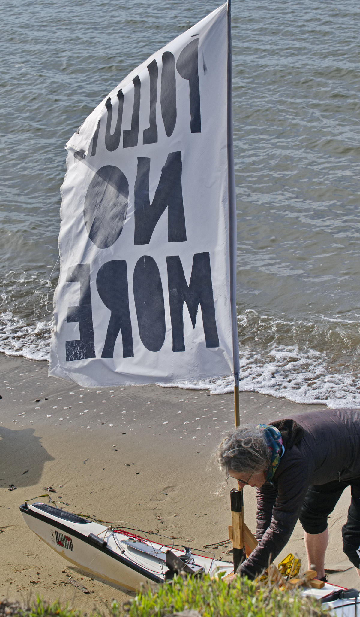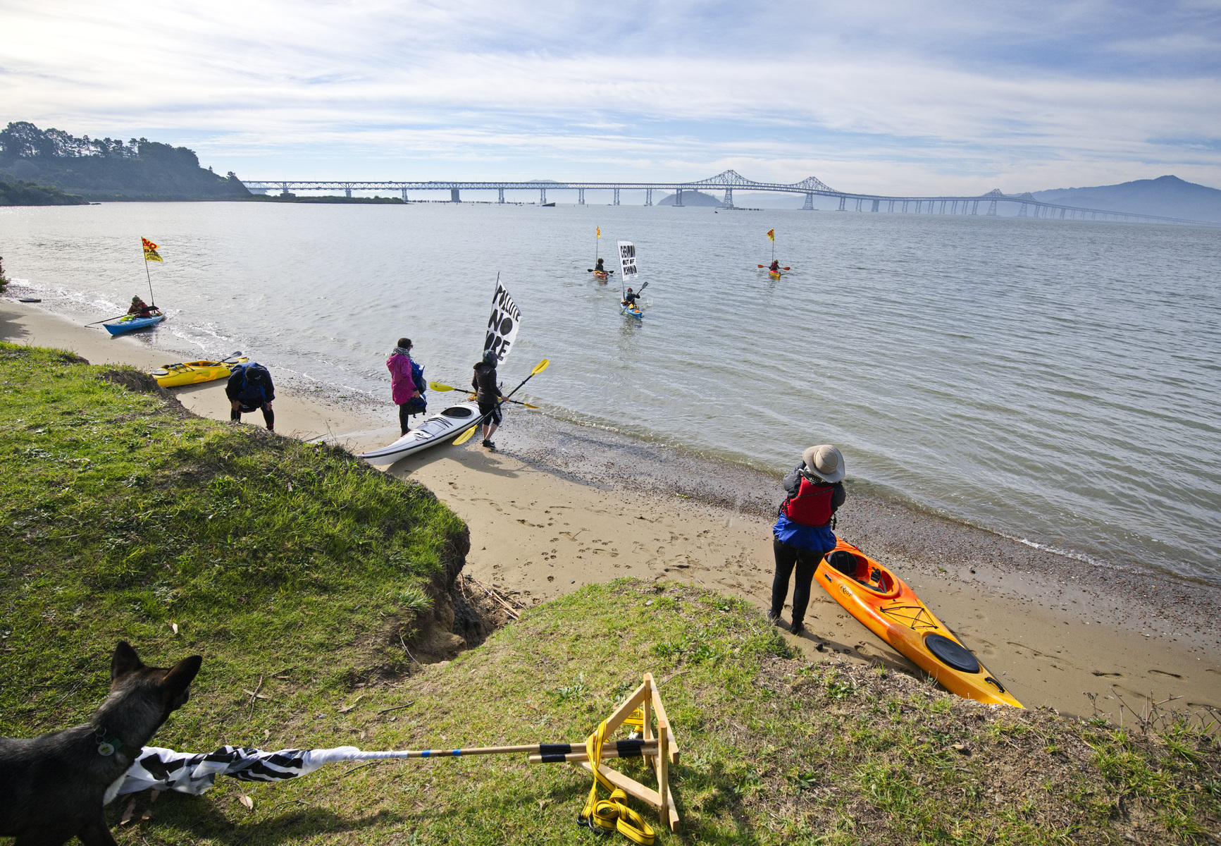 (Point Molote, Richmond, Jan. 17) - On Saturday morning, kayakers deploying large banners and art took to the waters off Chevron's Richmond refinery, calling out Chevron's role in fueling war, environmental pollution and corporate greed, from Richmond to Gaza to Venezuela.Building on the momentum of last week's protest at the gates of the Chevron refinery, local boaters are raising banners off Richmond's shoreline, near Chevron's Long Wharf, calling for an end to U.S. occupation of Venezuela and Chevron's fueling of war around the globe.