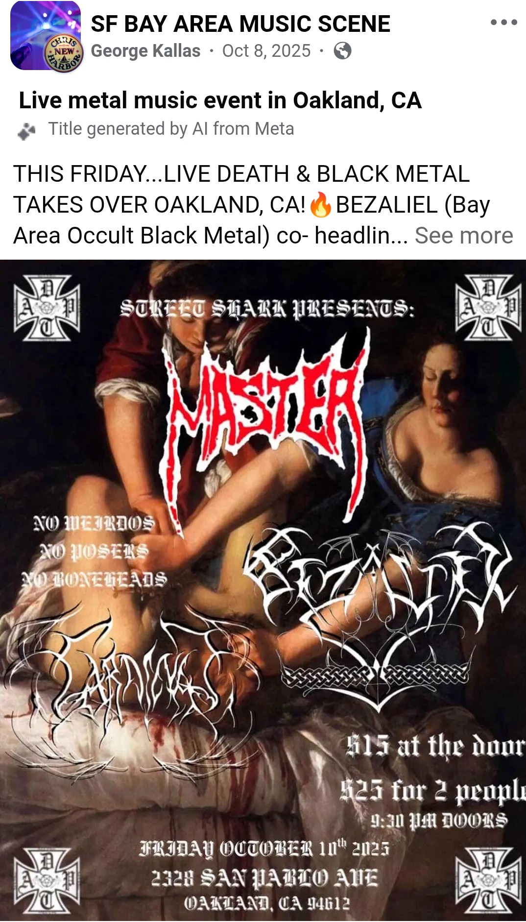 Bezaliel (as well as Cardinal) booked a show for 80s death metal band Master on October 10 at Victory Stables in Oakland. That day, Master was supposed to play with death metal band Ripped To Shreds at 924 Gilman, however Ripped To Shreds (a band of all people of color whose leader has called out white supremacy in the local metal community) dropped off a few weeks before after Master played a festival with several neo-Nazi metal bands, including Arghoslent, whose lyrics glorify the slave trade.