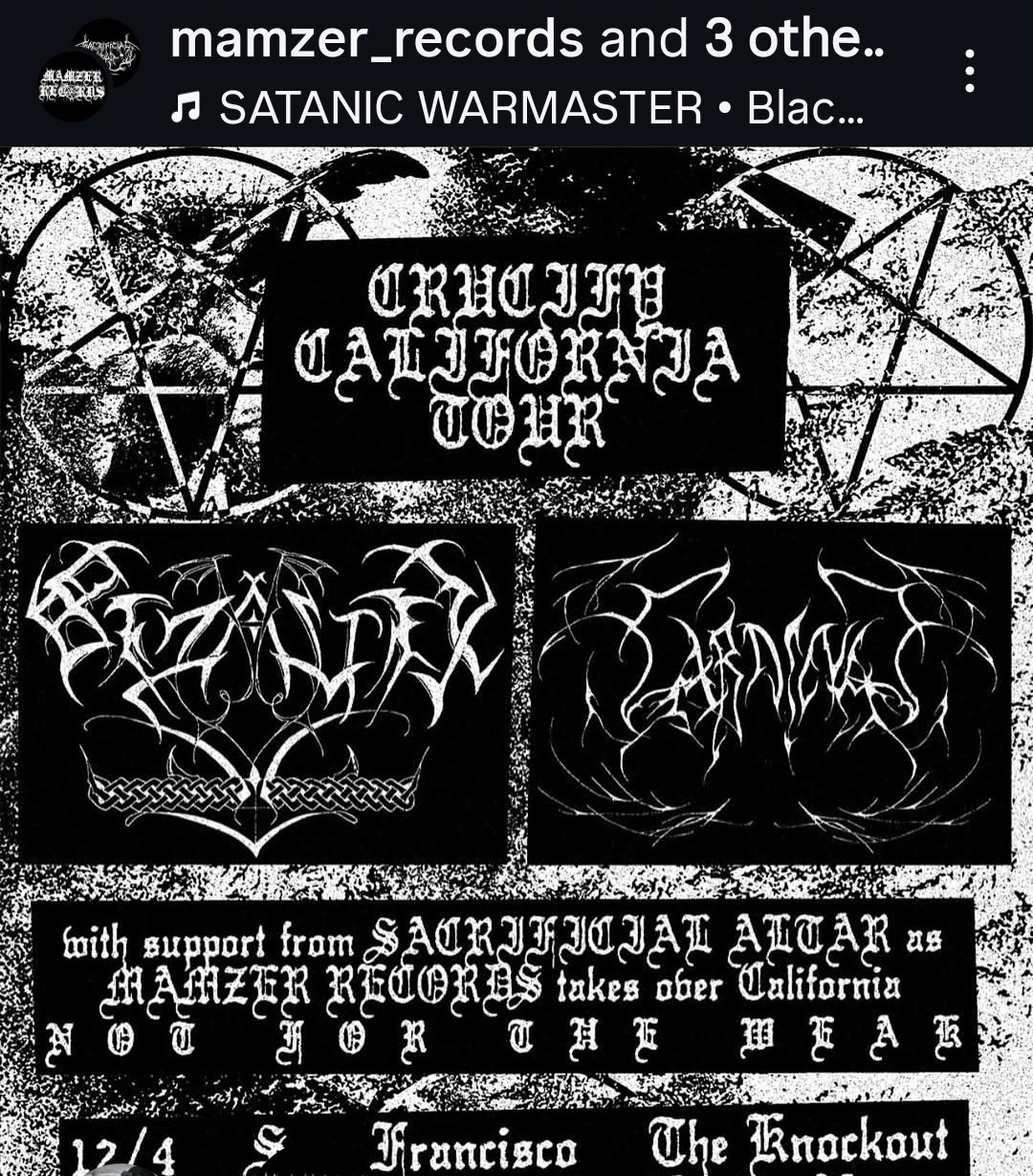 On January 24, there will be a black metal show at Neck Of The Woods featuring Bezaliel, an "occult black metal" band that may not seem like Nazis on the surface, but they still have acted in an extremely problematic way. The flyer is attached below. The names of the other bands are airbrushed out, as it is unknown whether the other bands on that slate, Sinister Sounds Booking, or Neck Of The Woods know the full extent of their toxic Trojan Horse fash behavior.