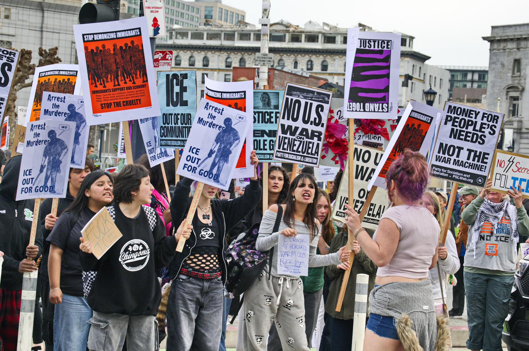 (SAN FRANCISCO, January 20) — On the one-year anniversary of Donald Trump’s inauguration, thousands of Bay Area residents walked out of their schools and workplaces and marched through the streets of San Francisco to reject authoritarian rule, ICE violence, and the administration’s escalating war on Venezuela. The action was part of a coordinated national walkout called for by Women’s March, with hundreds of demonstrations across the country disrupting business as usual to confront a rapidly intensifying fascist agenda.The Bay Area march stood in solidarity with communities in Minnesota resisting the violent occupation of their state by 3,000 ICE agents. Protesters gathered at Civic Center Plaza, where speakers condemned the Trump administration’s sweeping assault on fundamental rights and called for mass resistance to protect immigrant communities, queer and trans people, workers, families, and our collective futures.