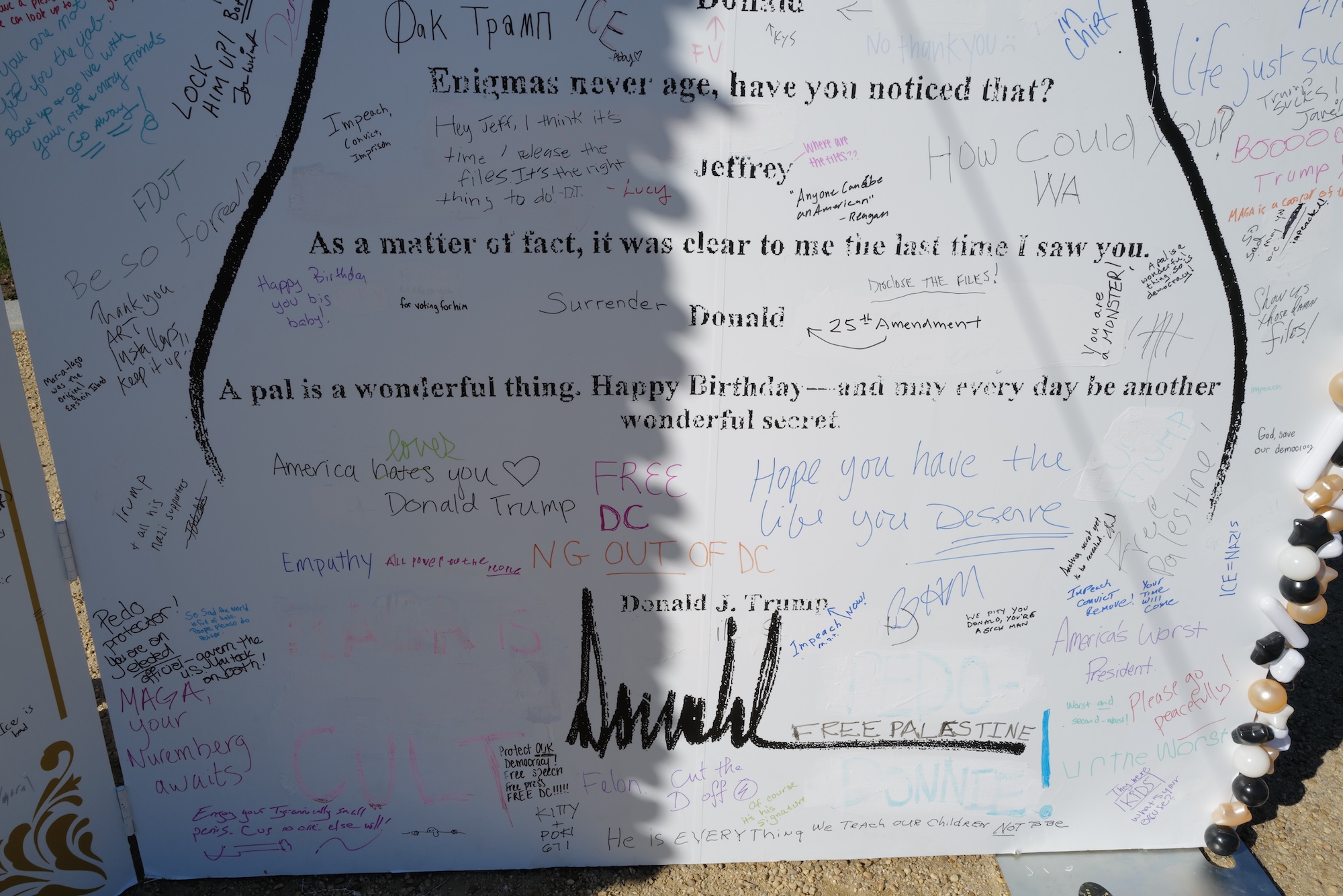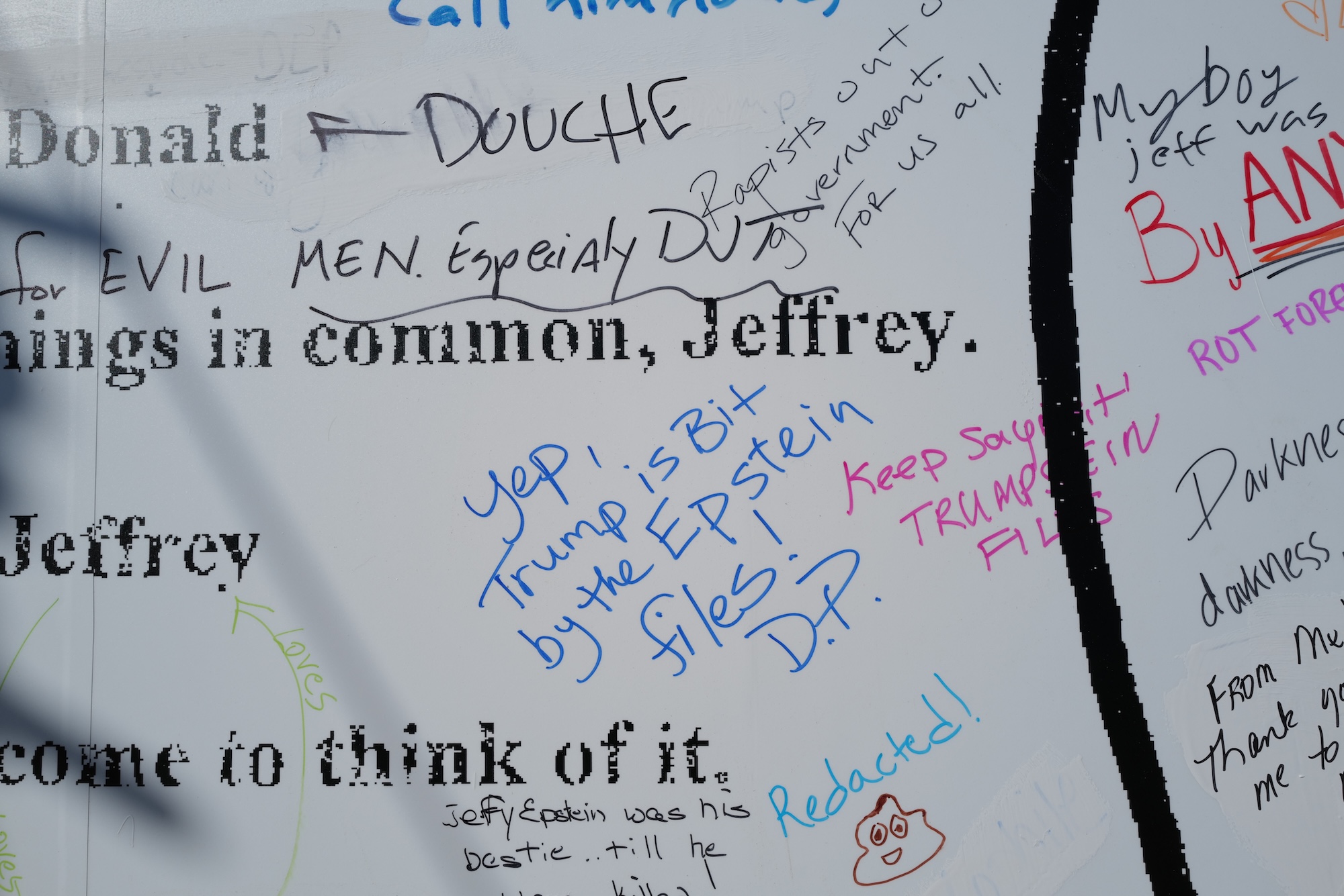 A quick perusal of messages left by passersby– in between people wishing to take selfies in front of the card – reflect opinions on the Trump/Epstein relationship, the unreleased files and the present regime’s contempt for our democracy and Trump’s embrace of authoritarianism.
