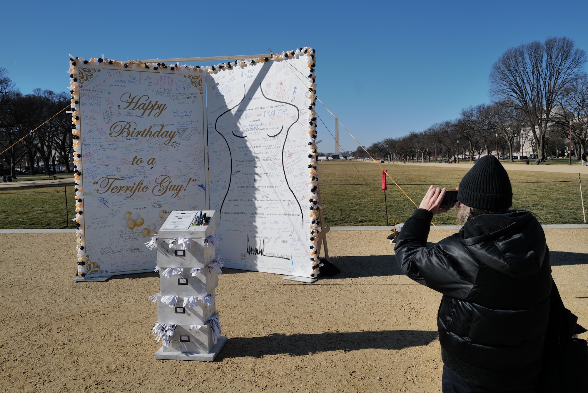 WASHINGTON (01-21) – In a city intensely involved in all matters political 24/7/365, a bit of ironic levity regarding the Trump/Epstein relationship has become the latest tourist attraction in acknowledging Epstein’s birthday on January 20. The installation recreates the alleged birthday card sent by Trump to Epstein in 2003.