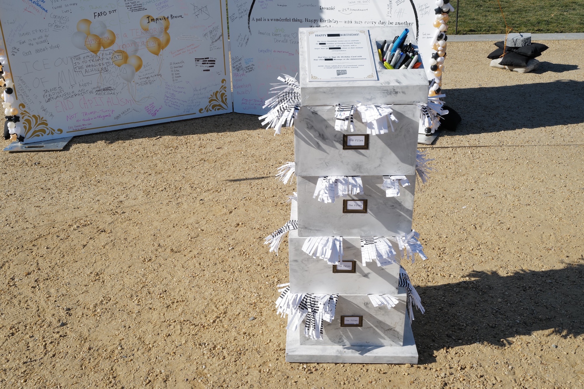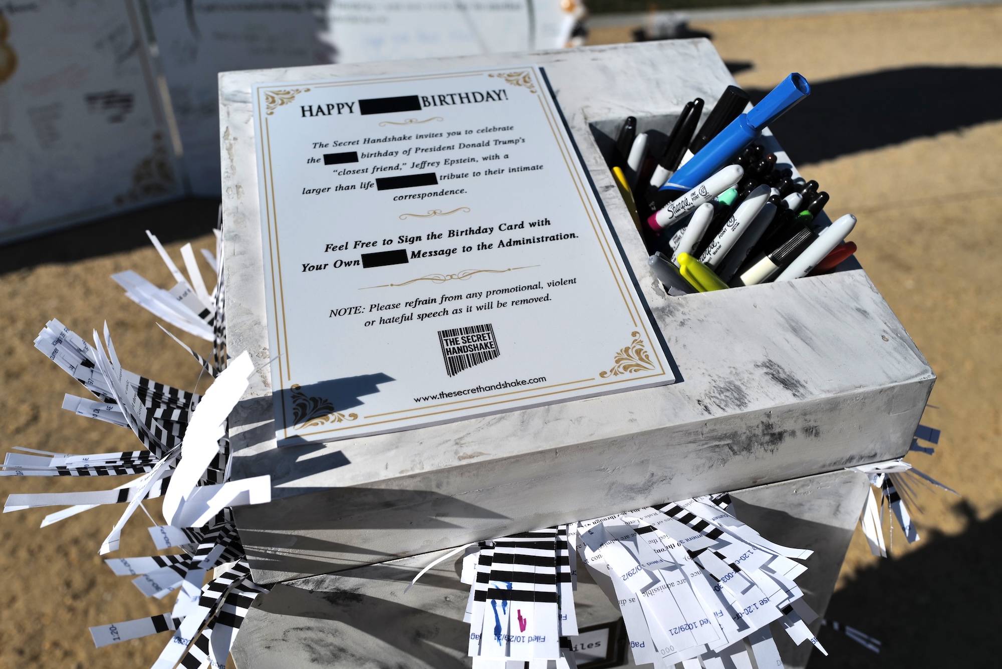 In front of the birthday card is a stack of four faux marble boxes parodying the stalling by the Justice Department to release all the infamous Epstein files as required by law. Each box labeled “The Files” has numerous pieces of shredded paper sticking out, all partially marked with black redactions.