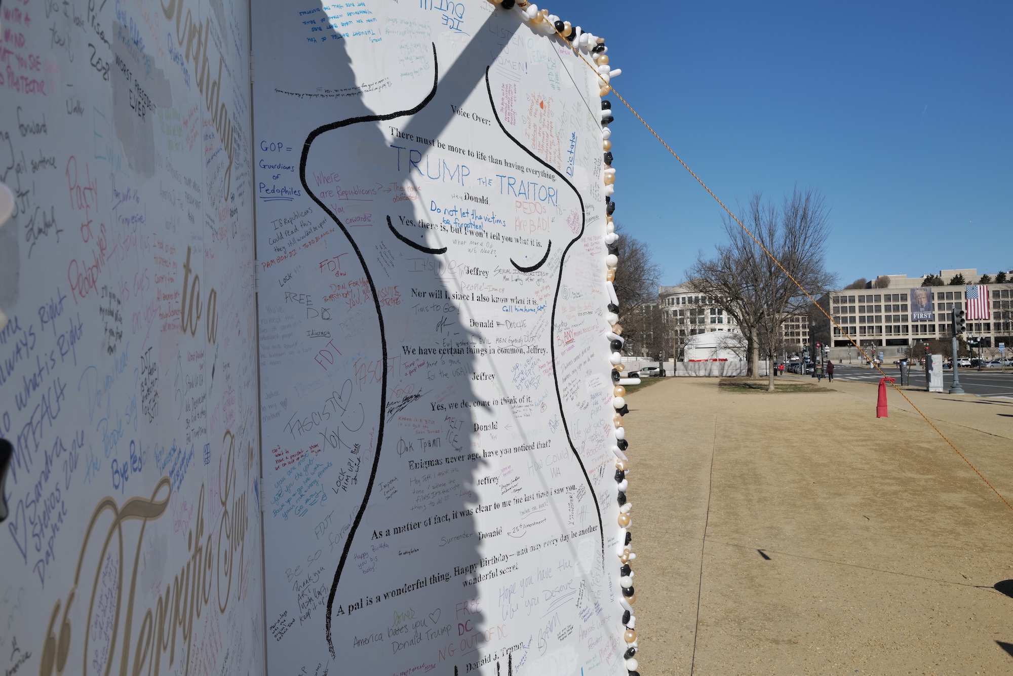 Located on the National Mall near the Capitol, the Trump birthday card for Jeffrey Epstein, is overseen by a massive two-story scowling Trump portrait in the background on the side of the US Department of Labor building.
