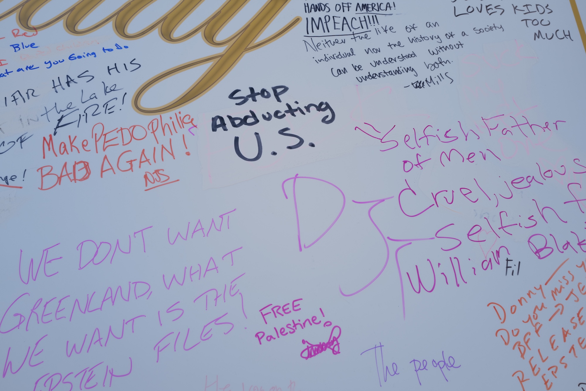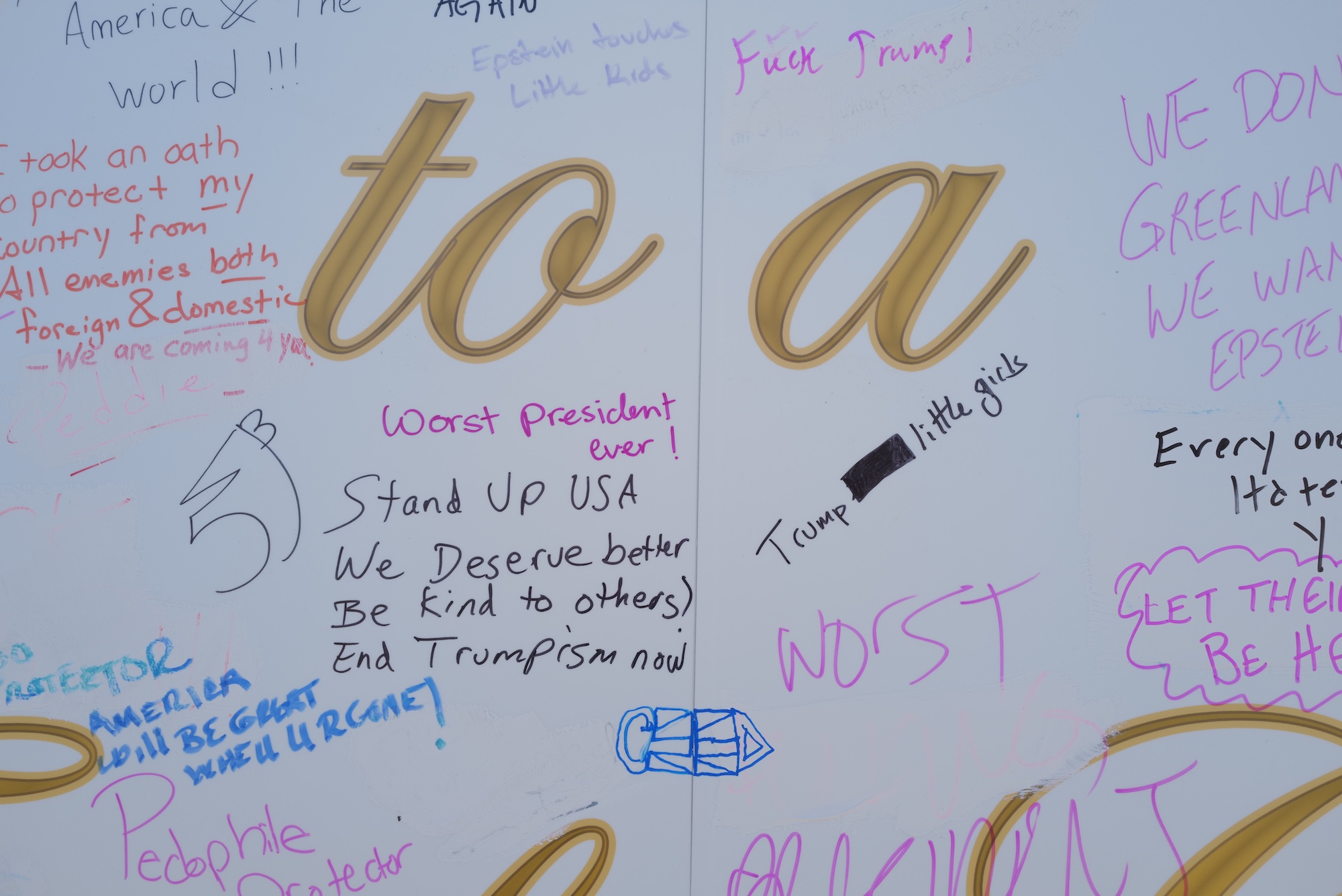 Among them are “Worst president ever! Stand up America we deserve better, We don’t want Greenland, what we want is Epstein files, Yep, Trump is bit by Epstein files, 25th amendment, We, pity you Donald you are a sick man, Your time will come,” and much more.