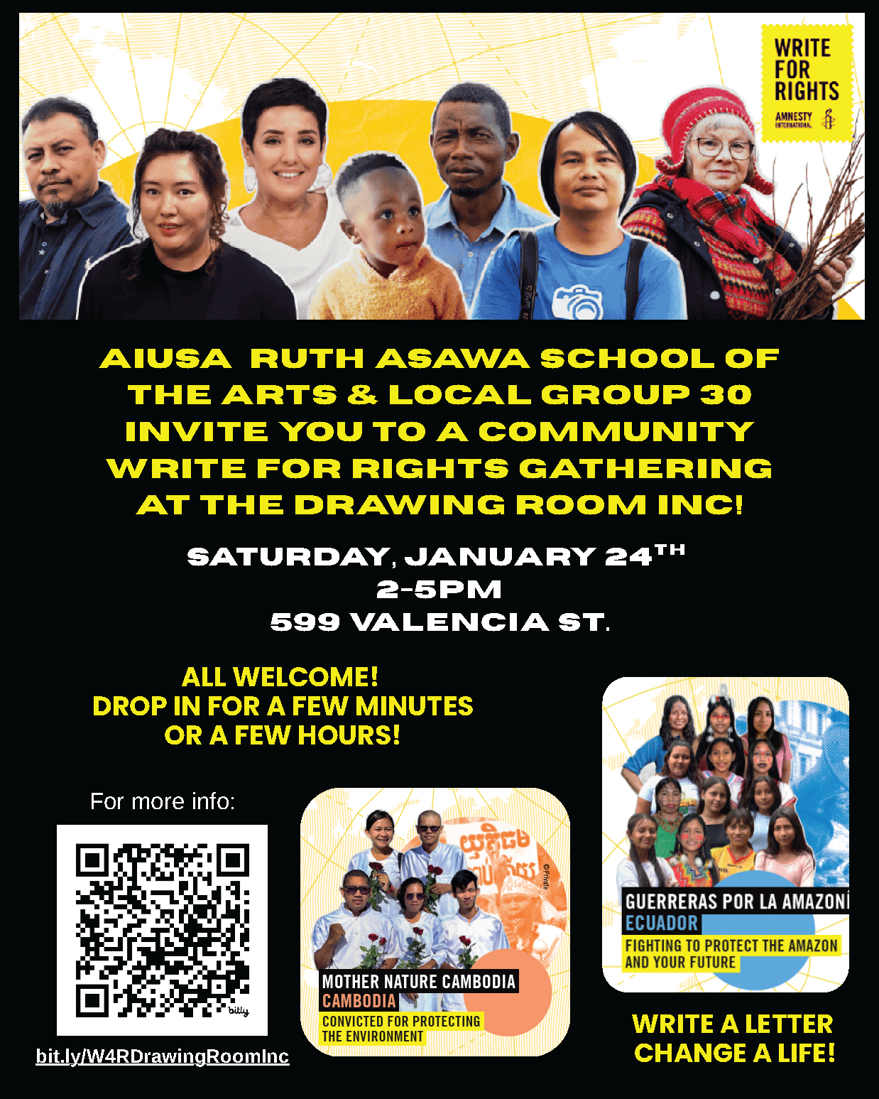 The amazing and wonderful community space in the Mission, the Drawing Room Inc. (https://drawingroominc.org) is hosting Amnesty International's annual Write for Rights, for a community inter-generational gathering. Come check out their exhibit Sanctuary and then grab a cup of Khushbu chai and write and/or draw for human rights!