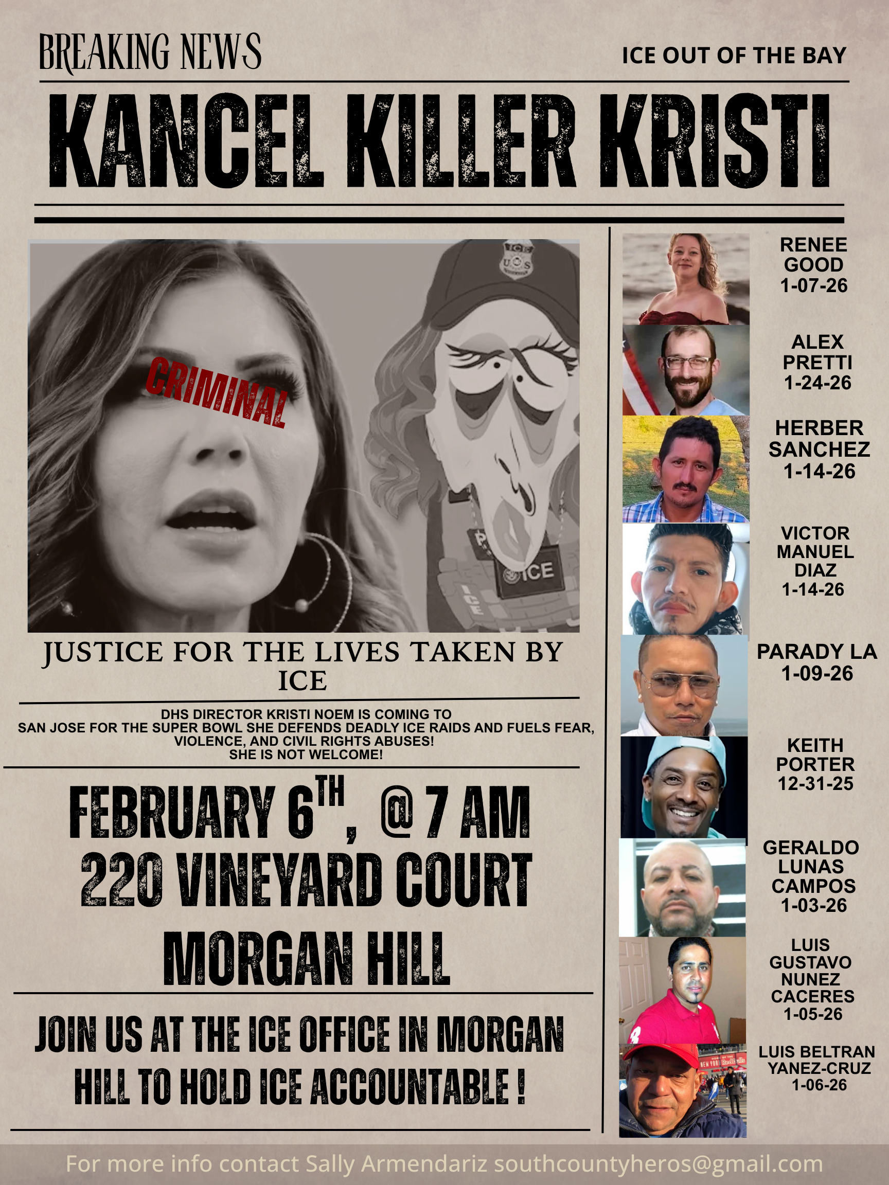 2/6/26 @7am. The goal of this protest is in front of the ICE Office to hold ICE and Kristi Noem accountable for all those whose lives have been lost to ICE. We also want to honor the lives lost. Kristi Noem is visiting Santa Clara County next weekend for the super bowl and we want to make sure our voices don’t go unheard! show up, show out, and kick ICE out of the bay!