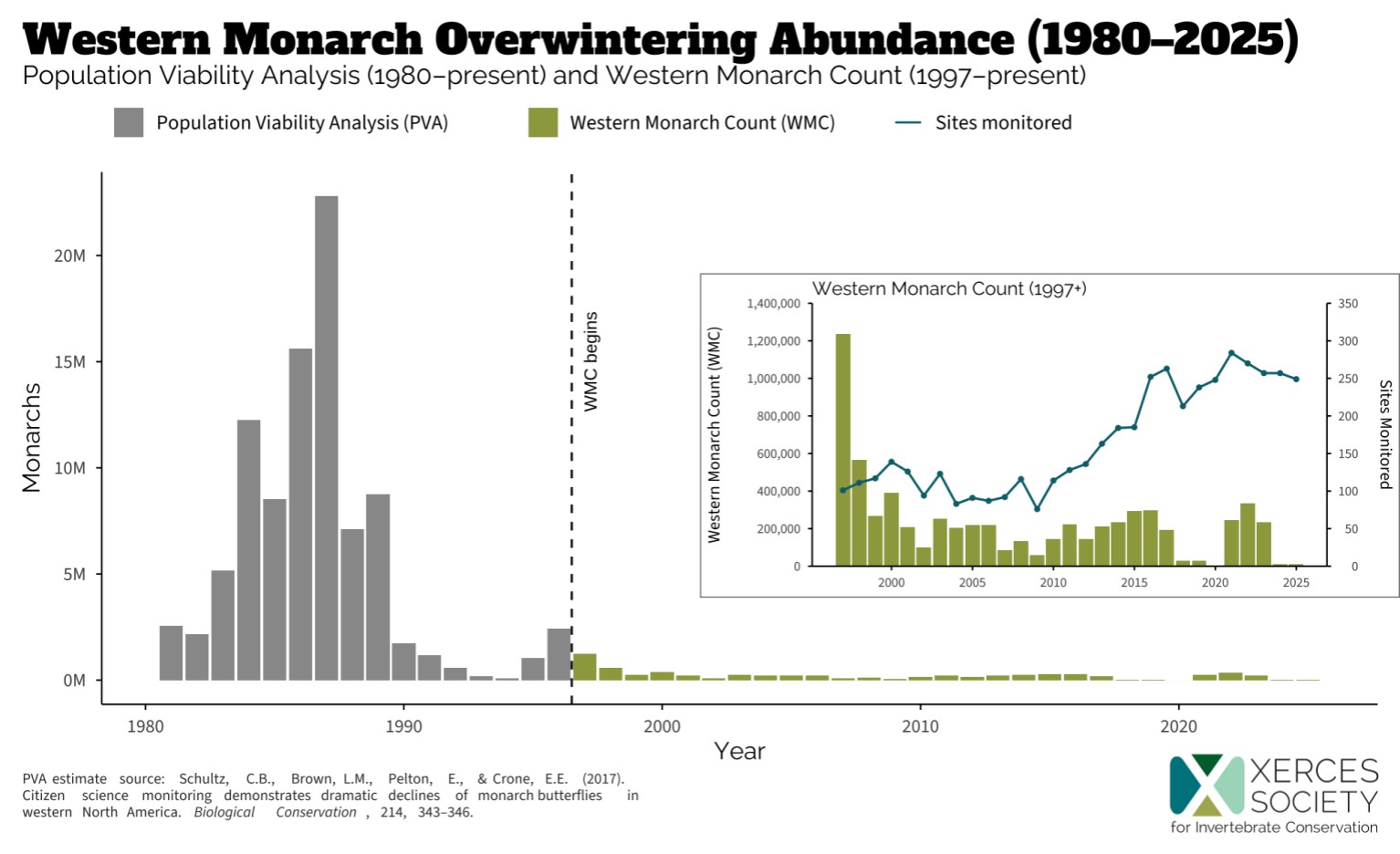 SAN FRANCISCO; January 29, 2026 – After surveys by hundreds of volunteers and partners, results from the 29th annual Western Monarch Count led by the Xerces Society for Invertebrate Conservation reveal another historically low population. Approximately 12,260 monarchs were recorded across 249 sites during the typical peak overwintering period from late November through early December 2025, when monarchs cluster together in groves of trees along California’s coast.