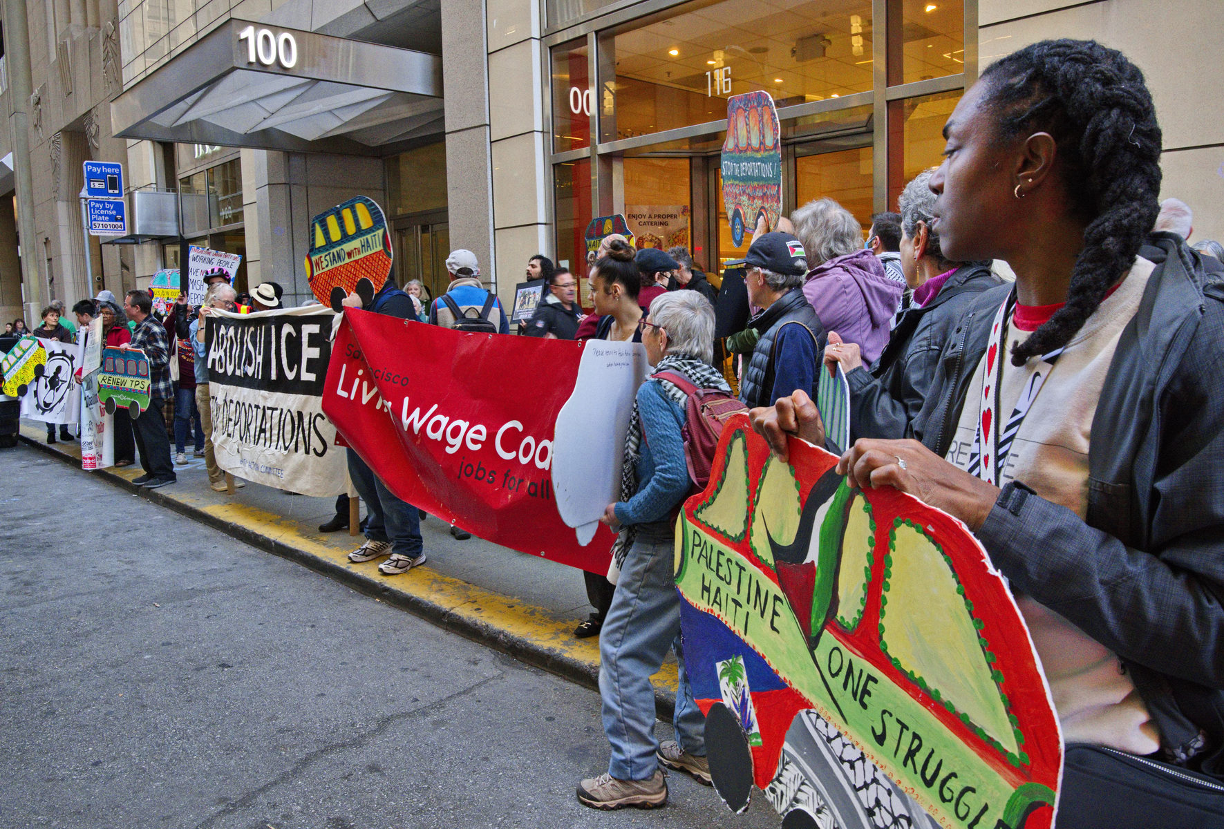 The protest was timed for maximum visibility during the afternoon commute on Montgomery Street, colloquially known as "Wall Street West." The over fifty demonstrators held a rally, distributed flyers to passing cars and trucks and received considerable honking support.