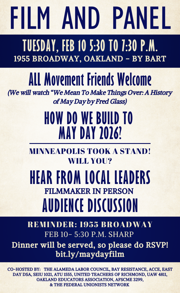 Co-sponsored by the Alameda Labor Council, Bay Resistance, the Federal Unionists Network, SEIU Local 1021, ACCE, AFSCME Local 3299, UAW Local 4811, Oakland Education Association (OEA), United Teachers of Richmond (UTR), and ATU Local 1555.
