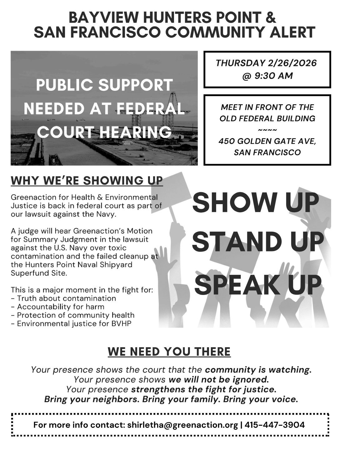 Greenaction for Health & Environmental Justice is back in federal court as part of our lawsuit against the Navy. A judge will hear Greenaction's Motion for Summary Judgment in the lawsuit against the U.S. Navy over toxic contamination and the failed cleanup t the Hunters Point Naval Shipyard Superfund Site.