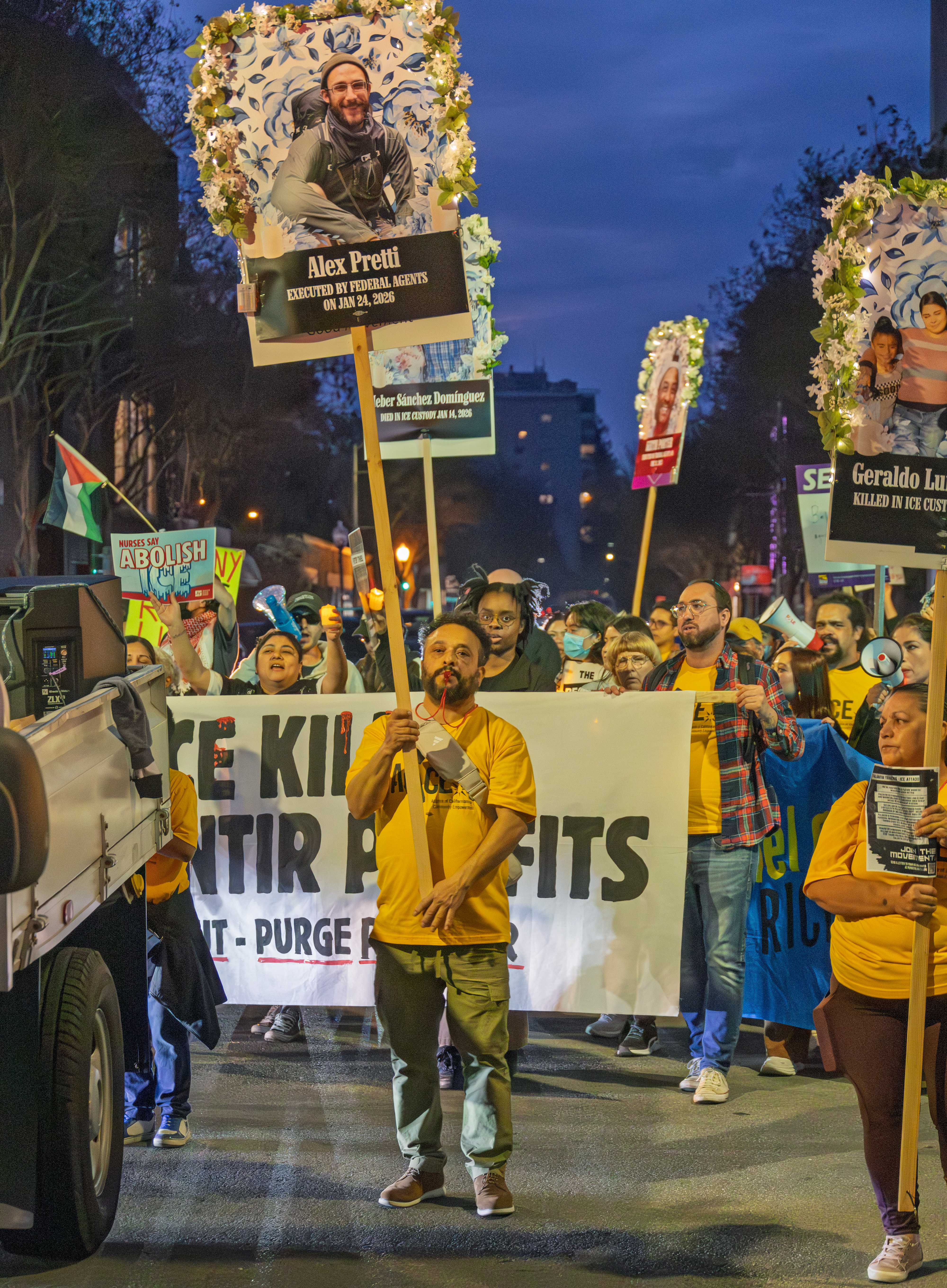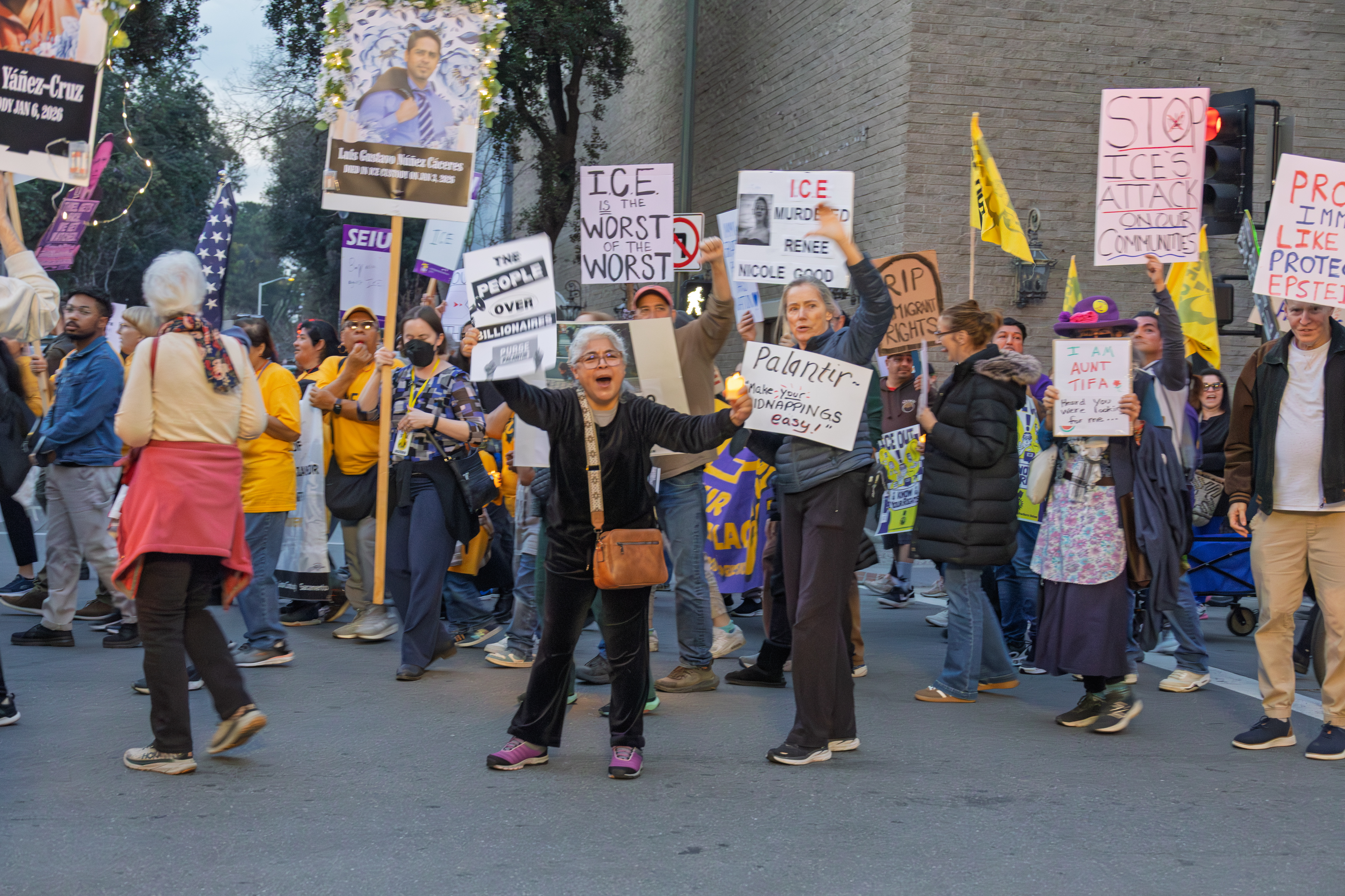Following a march from a nearby neighborhood park, a candlelit rally with projections upon the office building of Palantir, company complicit with ICE and the IDF.