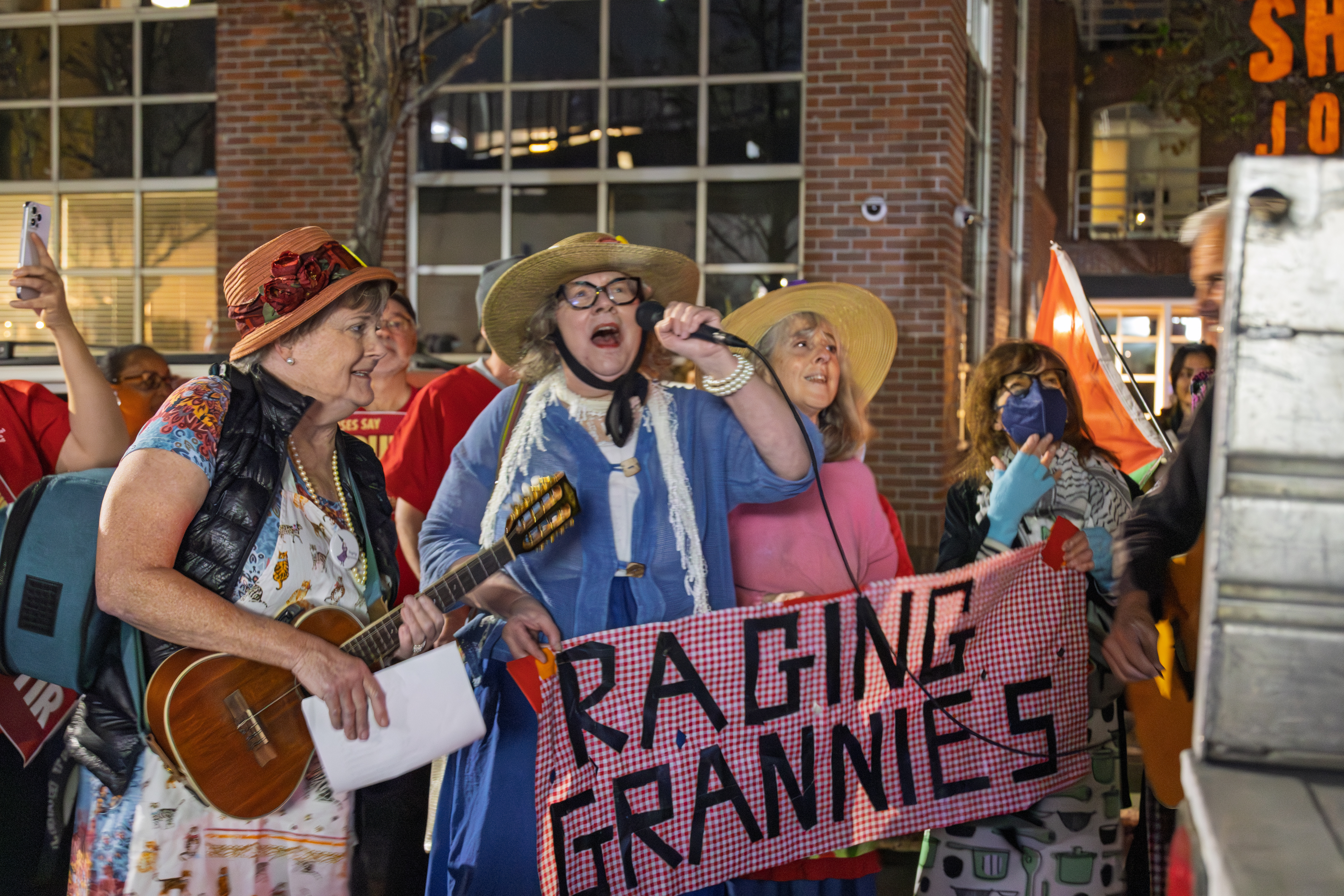 Many inspiring speeches from a flatbed truck and the Raging Grannies sang "Palantir is on a Highway to Hell".