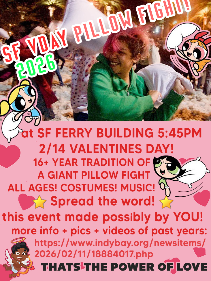 It's that time of year again! a 16+ years SF tradition! Come out to Embarcadero Plaza (rain or shine) on Saturday 2/14 (Valentines Day) for a giant Pillow Fight! It's a great way to make some new friends, find a date, or just have some good old fashioned fun!