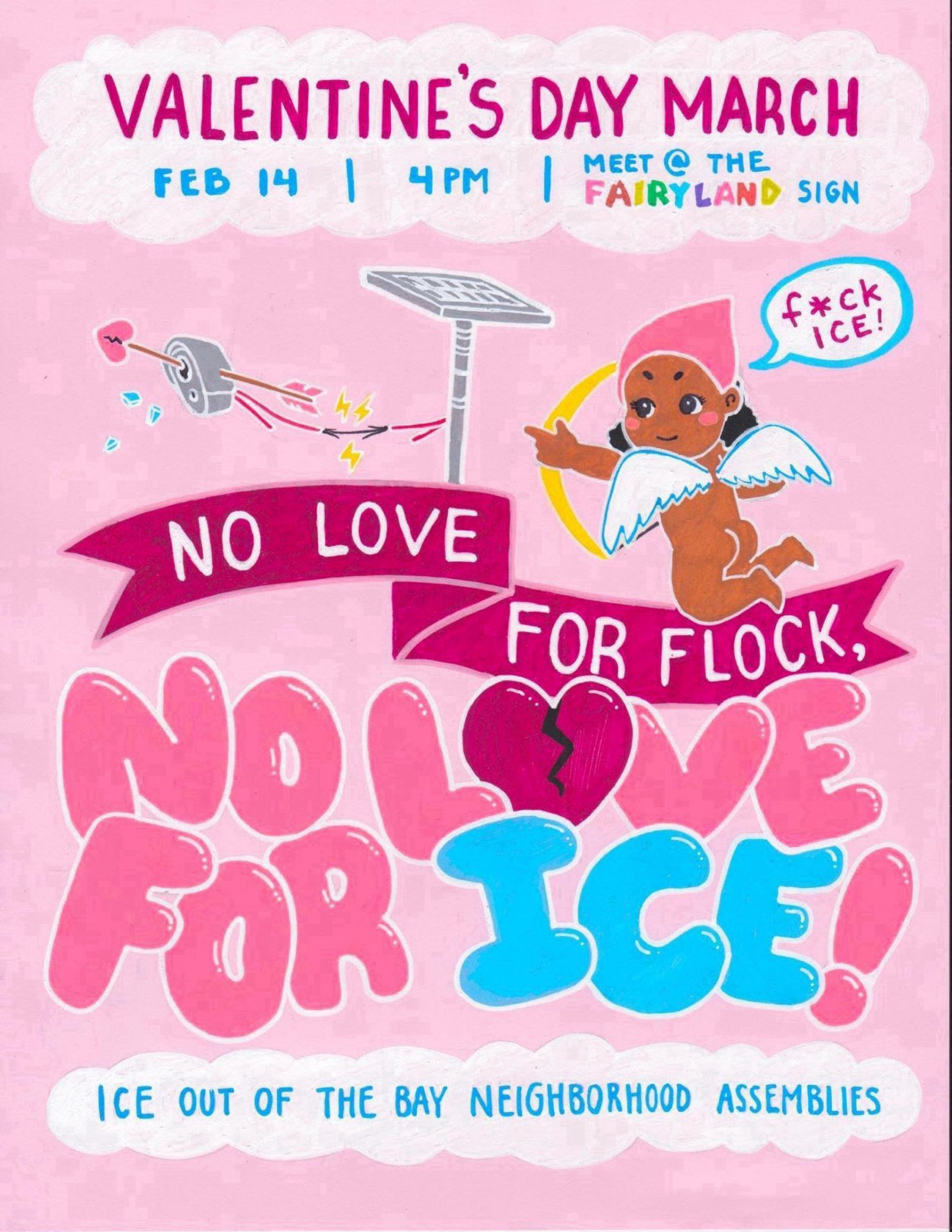 This Valentine’s Day, come celebrate your love for your neighbors and your commitment to protect each other against ICE gestapo. This includes rejecting the surveillance state they use to facilitate their work. We will rally and march for an ICE and Flock free Oakland!
