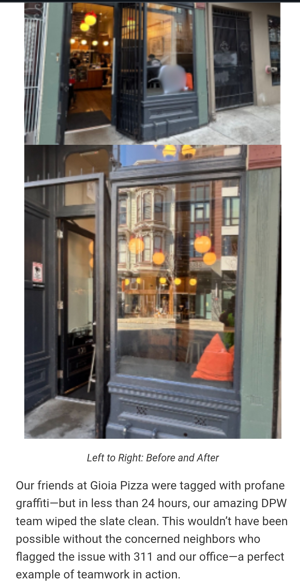 In March of 2025, Billionaire Backed Bilal's newsletter contained an item about how profane graffiti appeared on Gioia's pizza and how he had the clean up expedited. What he doesn't tell you, and its blurred out in the photos, is that the graffiti said "Fuck Bilal".