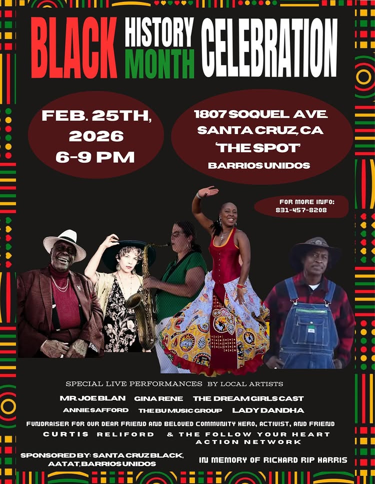 Join us for our Annual Black History Month Celebration! This event is sponsored by @santacruz.black and the African American Theater Arts Troupe (AATAT) & will include food, live music, and community.