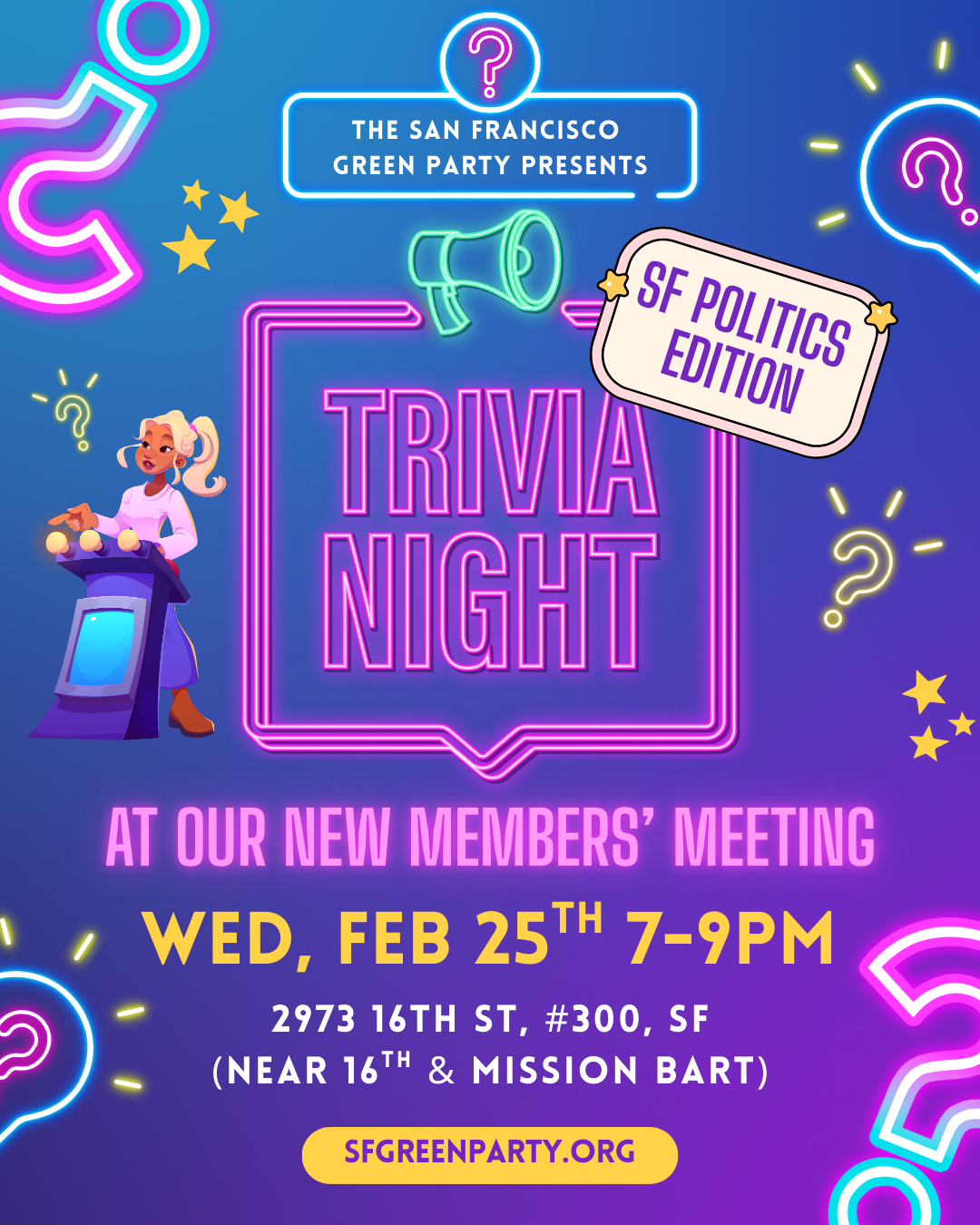 Wherever you're at, come out and play a Jeopardy! style trivia night with the SF Green Party at our New Members' Meeting! We'll have a quick review session of SF politics and government before the game starts for our newbies, so please try to join us right at 7.