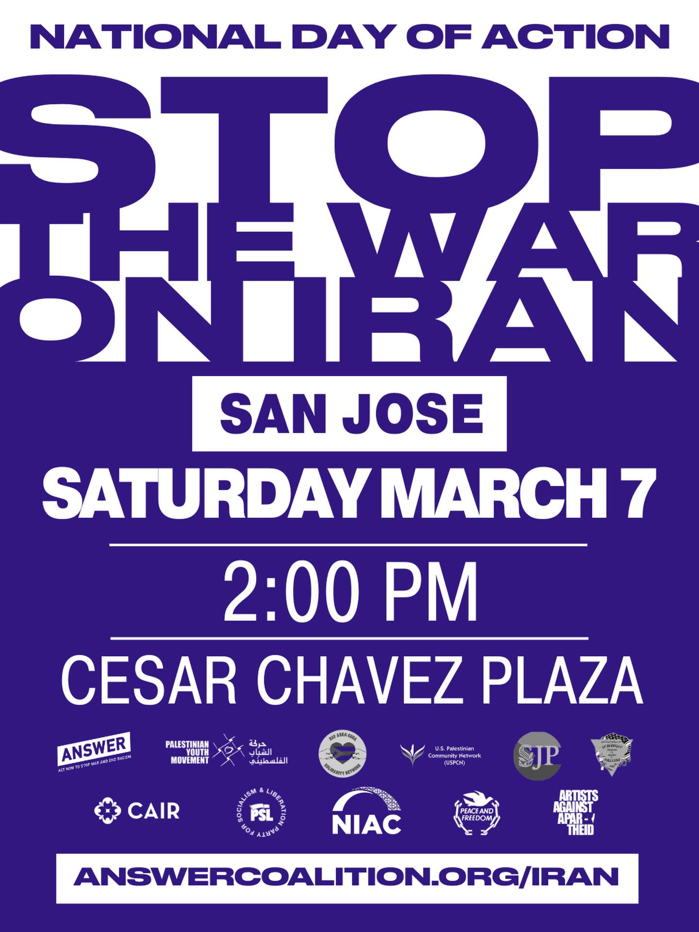 🚨SAN JOSE ACTION: This Saturday, March 7th, in cities and towns around the country, stand up to say No War on Iran!