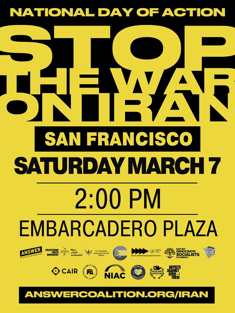 🚨SAN FRANCISCO ACTION: This Saturday, March 7th, in cities and towns around the country, stand up to say No War on Iran!