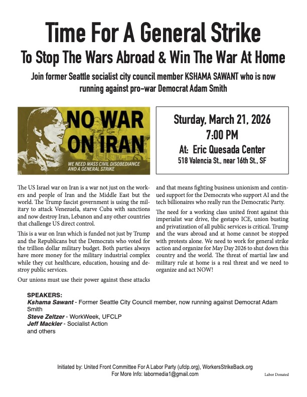 Join former Seattle Socialist city council member Kshama Sawant who is now running against pro-war Democrat Adam Smith.