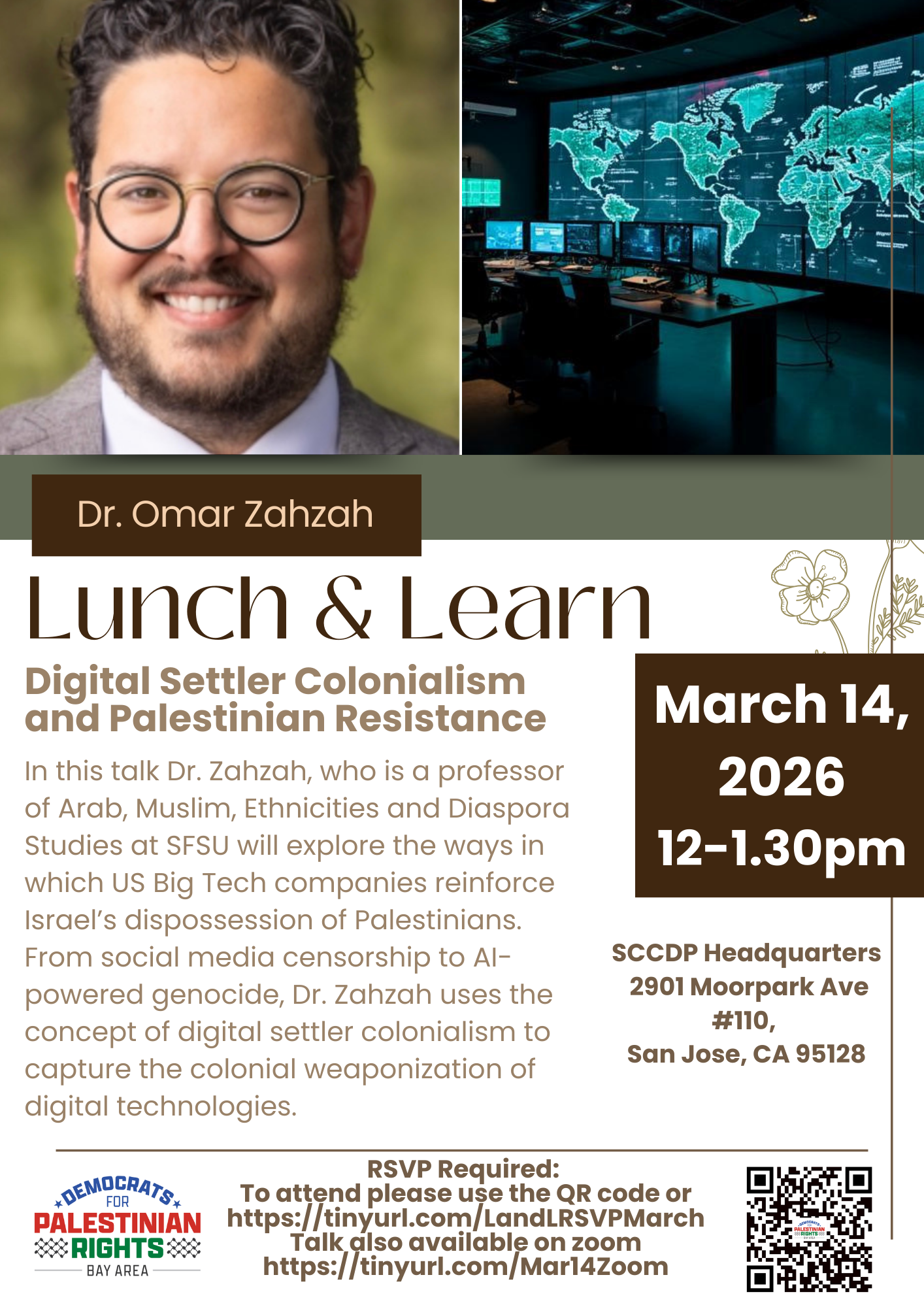 Dr. Zahzah will explore the ways in which US Big Tech companies reinforce Israel's colonial dispossession of Palestinians. From social media censorship to AI-powered genocide, Zahzah uses the concept of digital settler colonialism to capture the colonial weaponization of digital technologies.
