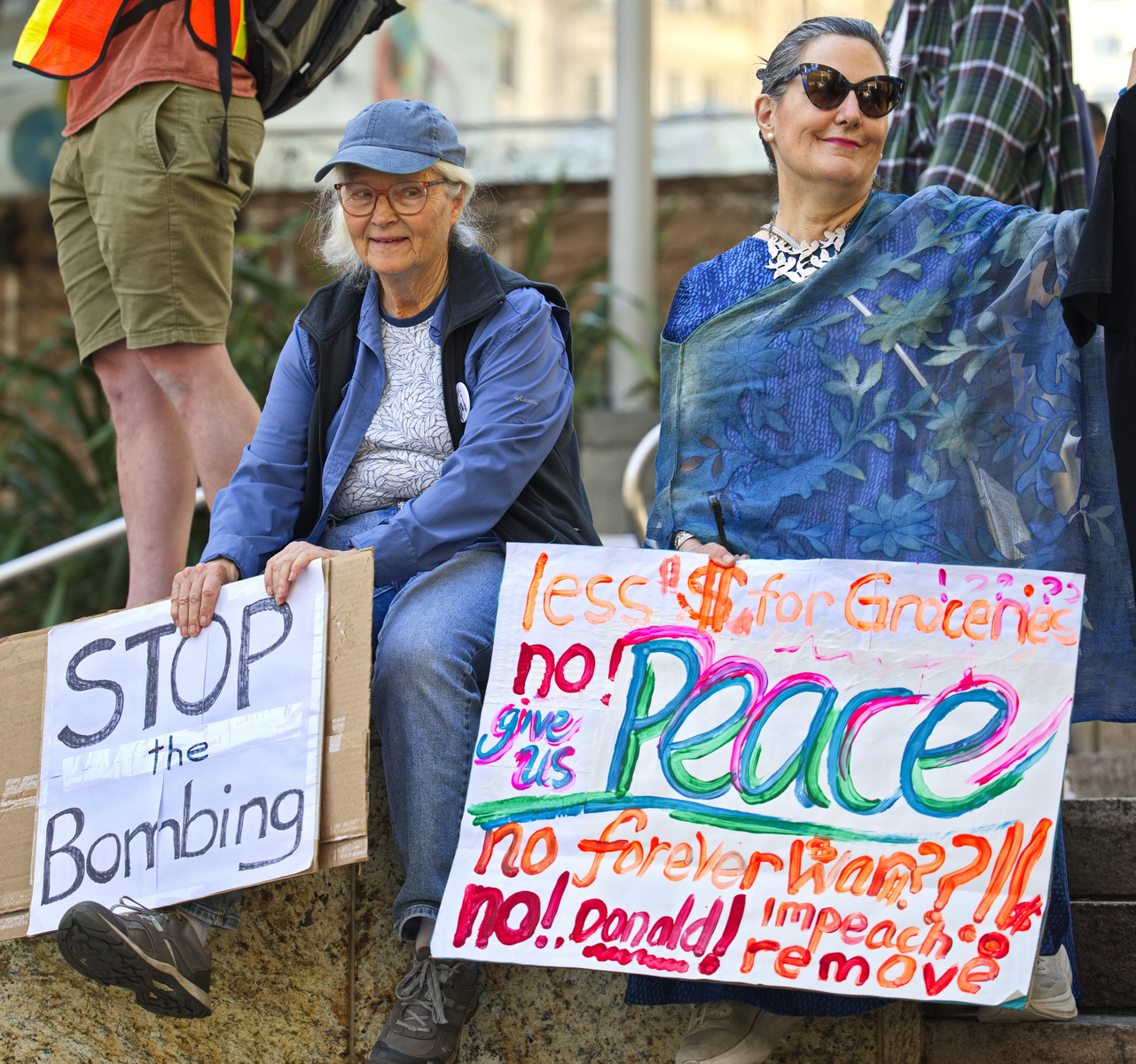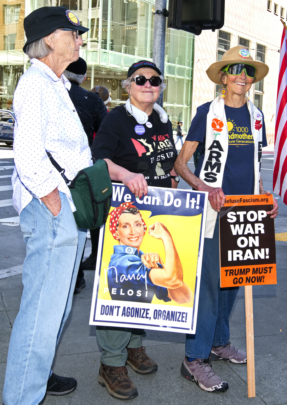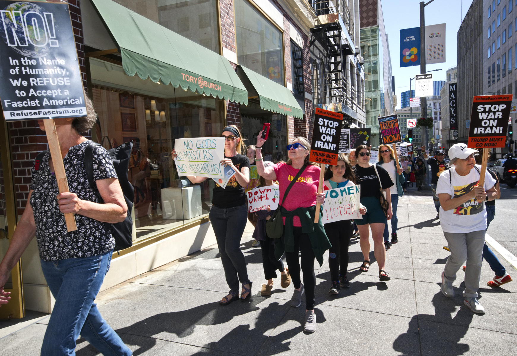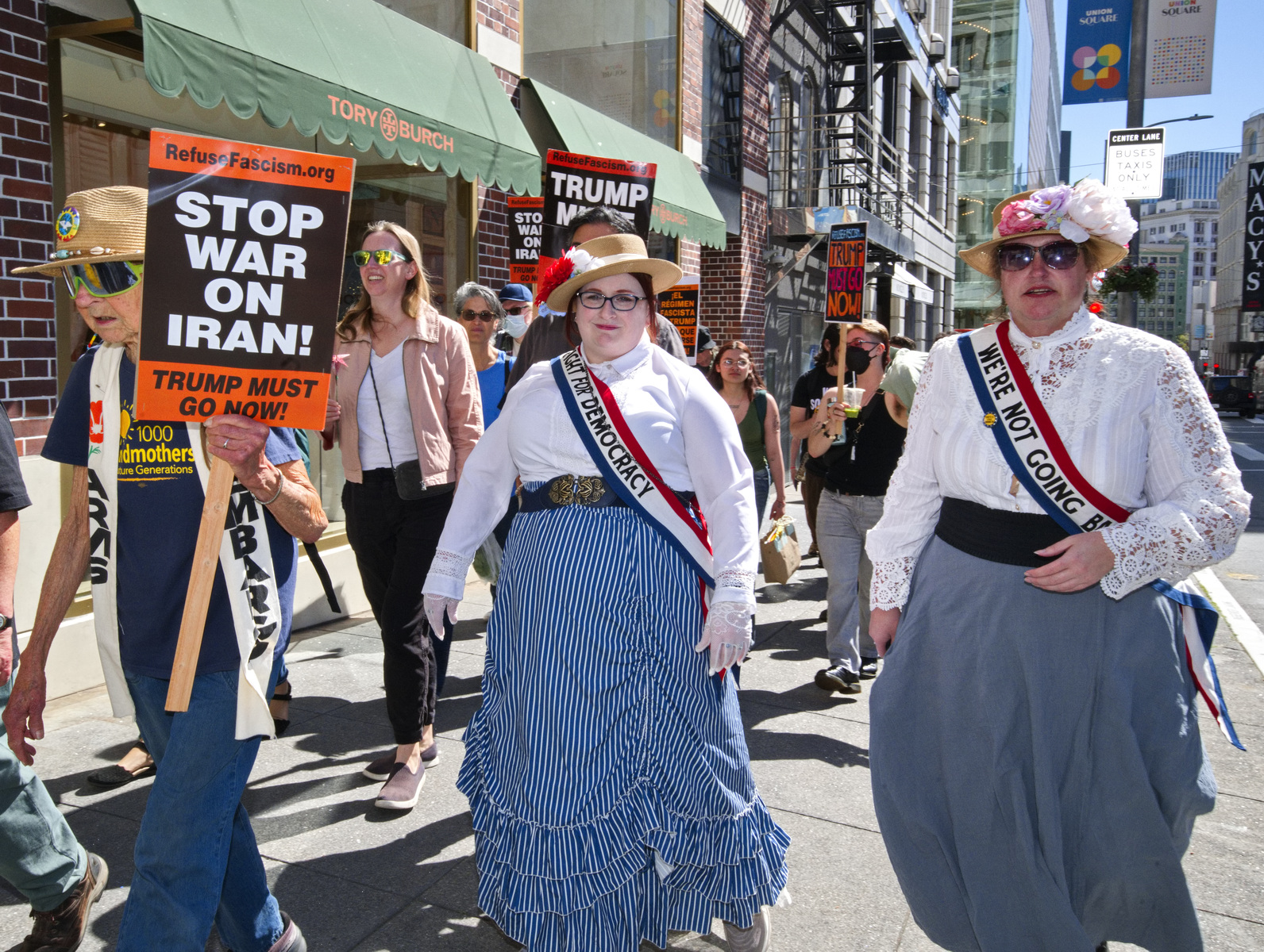 A protester held a sign calling Trump a misogynist pig (apologies to pigs). Many demanded a stop to the war on Iran and two women were dressed as 1900's suffragettes. Displaying a huge yellow "Trump Must Go Now" banner, the protesters held a march around Union Square.