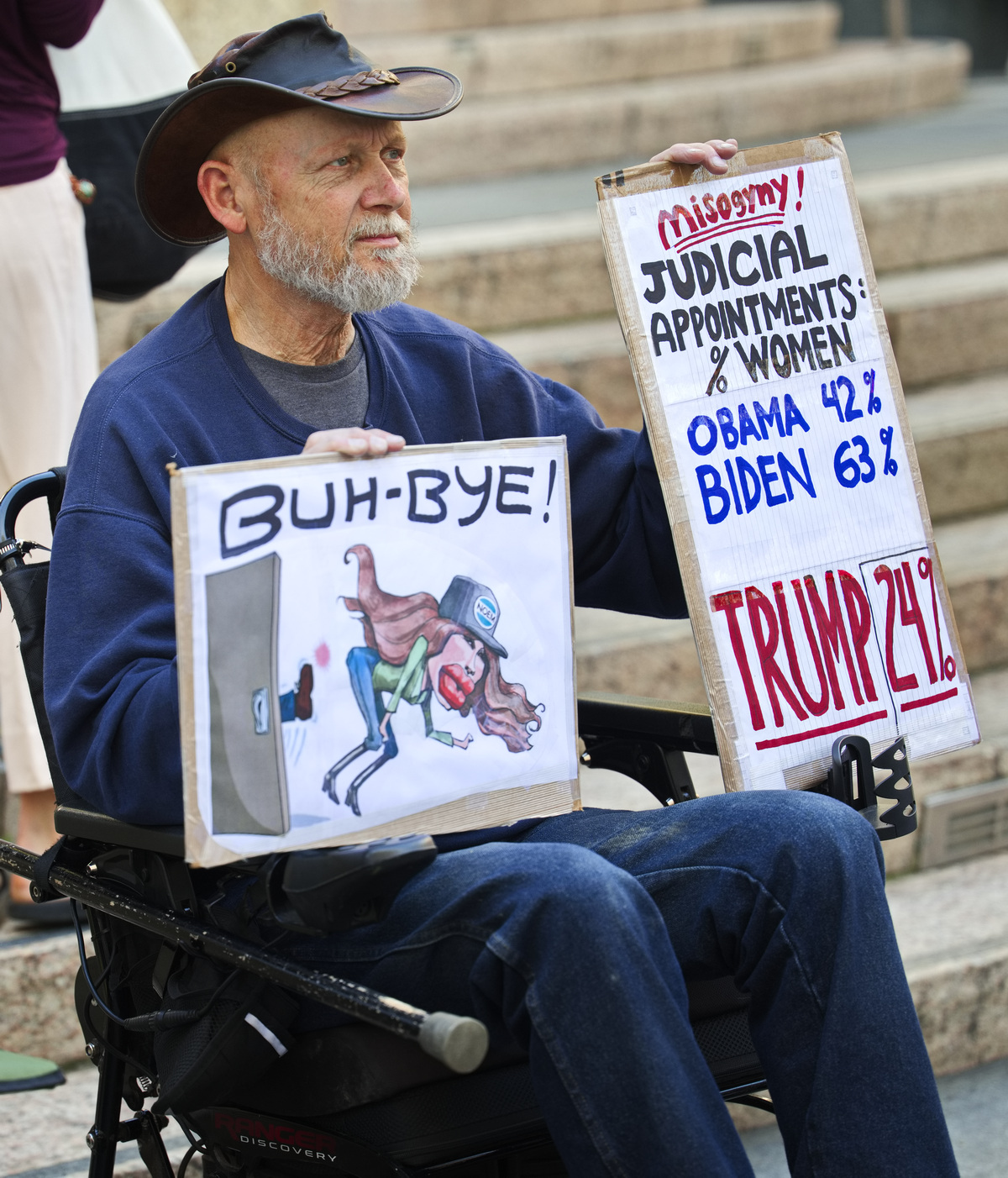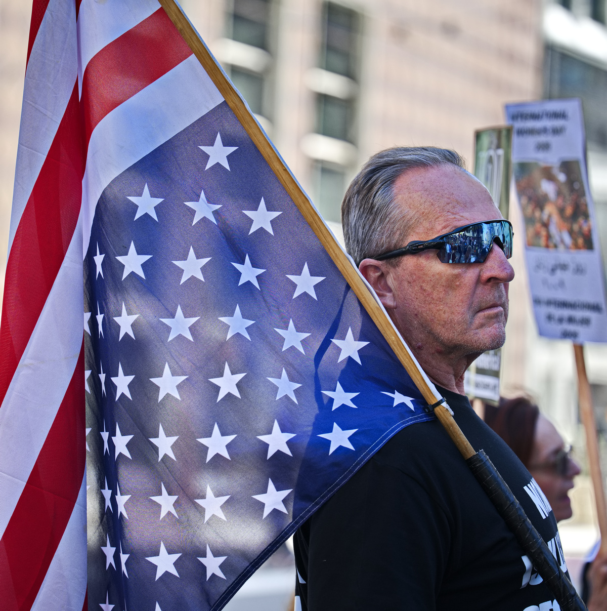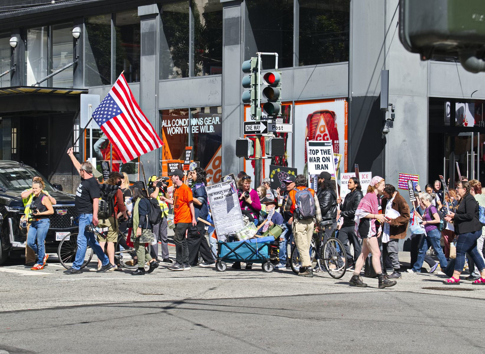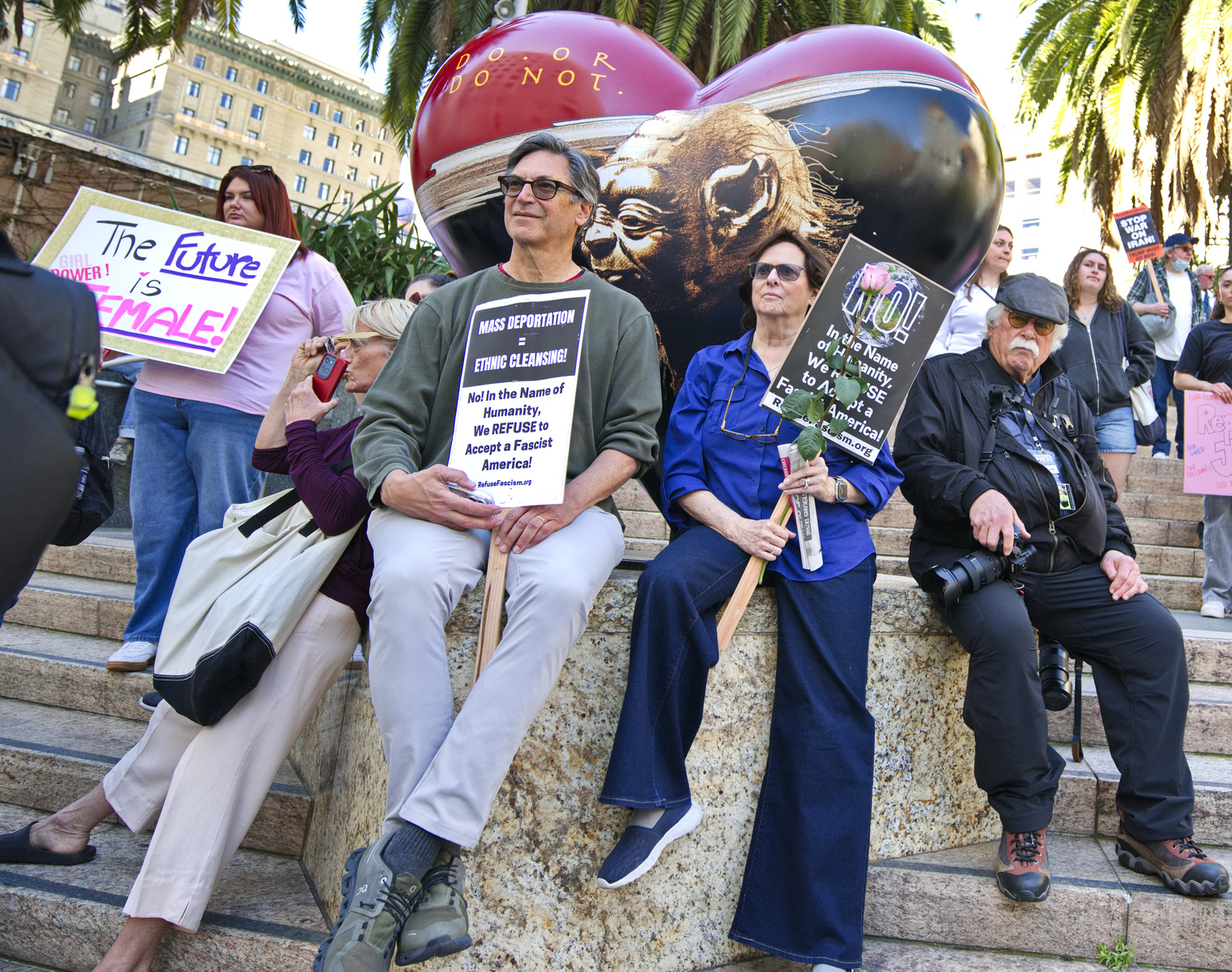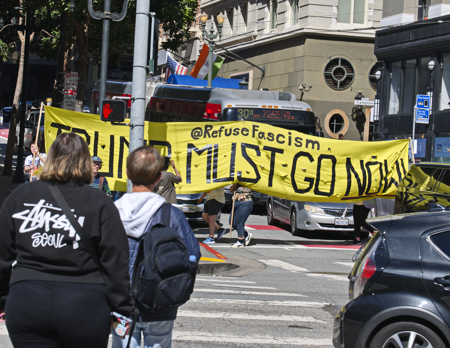A protester held a sign calling Trump a misogynist pig (apologies to pigs). Many demanded a stop to the war on Iran and two women were dressed as 1900's suffragettes. Displaying a huge yellow "Trump Must Go Now" banner, the protesters held a march around Union Square.