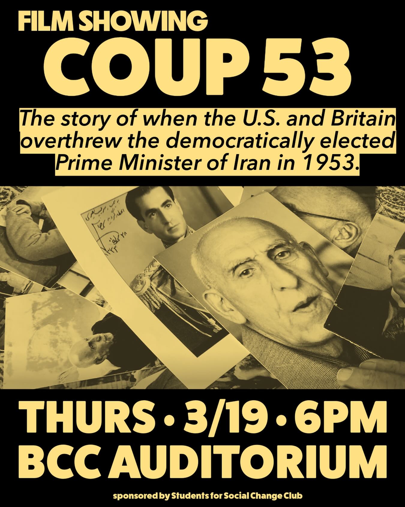 Join us for a film showing of the documentary Coup 53, the story of when the U.S. and Britain overthrew the democratically elected Prime Minister of Iran in 1953.