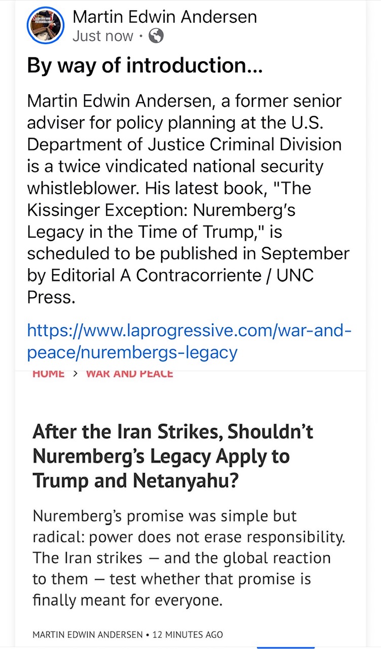 Martin Edwin Andersen, a former senior adviser for policy planning at the U.S. Department of Justice Criminal Division, is a twice vindicated national security whistleblower. His latest book, The Kissinger Exception: Nuremberg’s Legacy in the Time of Trump is scheduled to be published in September by Editorial A Contracorriente / UNC Press.