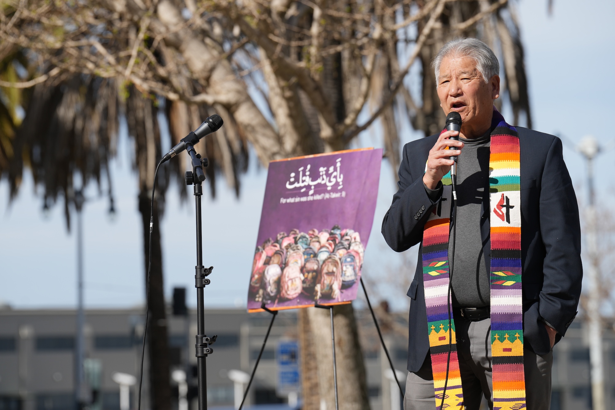 Several speakers at the Quds Day rally discussed the “US and Israel warmongering” along with the genocide in Gaza by addressing these injustices. Michael Yoshii, Sr. Pastor at the Buena Vista United Methodist Church of Alameda, spoke of solidarity with Palestinians and other oppressed people around the globe by relating his own family’s experience of forced displacement during WWII in 1942 through Executive Order 9066.