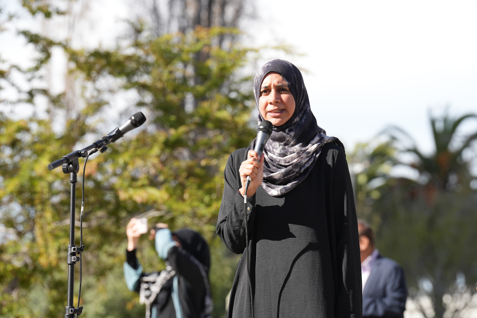 Expressing continued resistance to this latest war, she told the crowd: “For our brothers and sisters on the front lines against Zionism and US Imperialism whose lives have been cut short without their permission, they leave us behind to continue to advocate, to continue to march, to continue to chant, and to continue to look evil in the eye and say not on my watch, not on my time. I will do everything possible to confront you and stop you.”