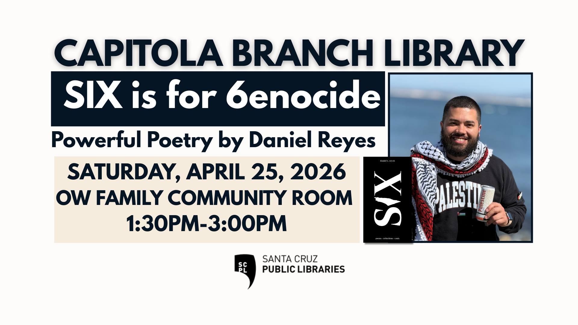 Join us as Daniel Reyes reads from his book SIX is for 6enocide, which is dedicated to the Alaydi family in Gaza, Palestine. Although not Palestinian himself, Daniel's book gives voice to those whose stories have been erased. His work seeks to circumvent censorship and erasure of any people through poetry, reflection, and rant. Copies of the book will be available for sale and signing, and light refreshments will be provided. Registration is recommended, and walk-ins are welcome.
