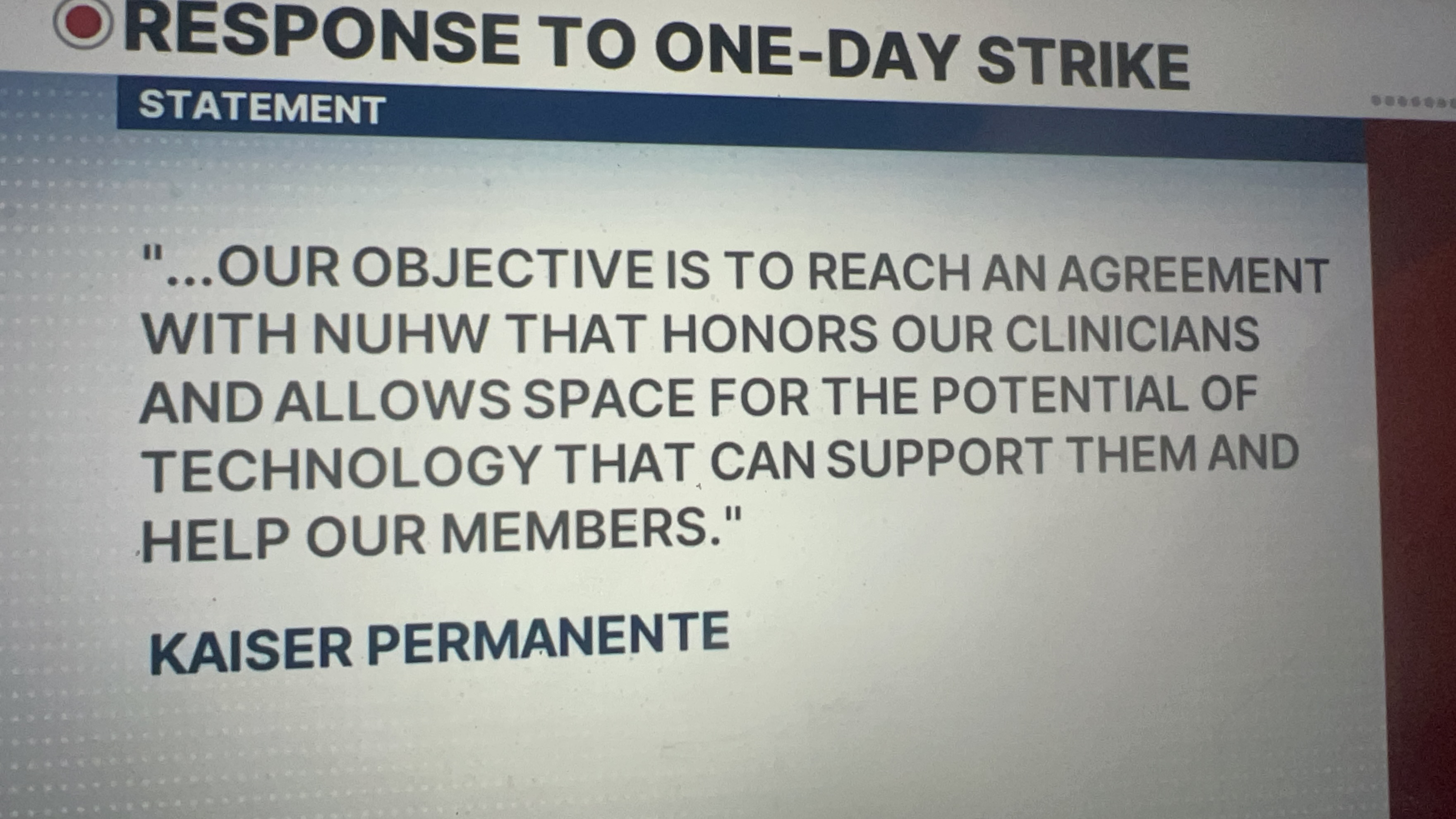 National Union of HealthcareWorkers NUHW and California Nurses Association NNU launched a one day UFLP strike of Kaisers in Oakland and other cities over AI and growing attacks on worker's health and safety.