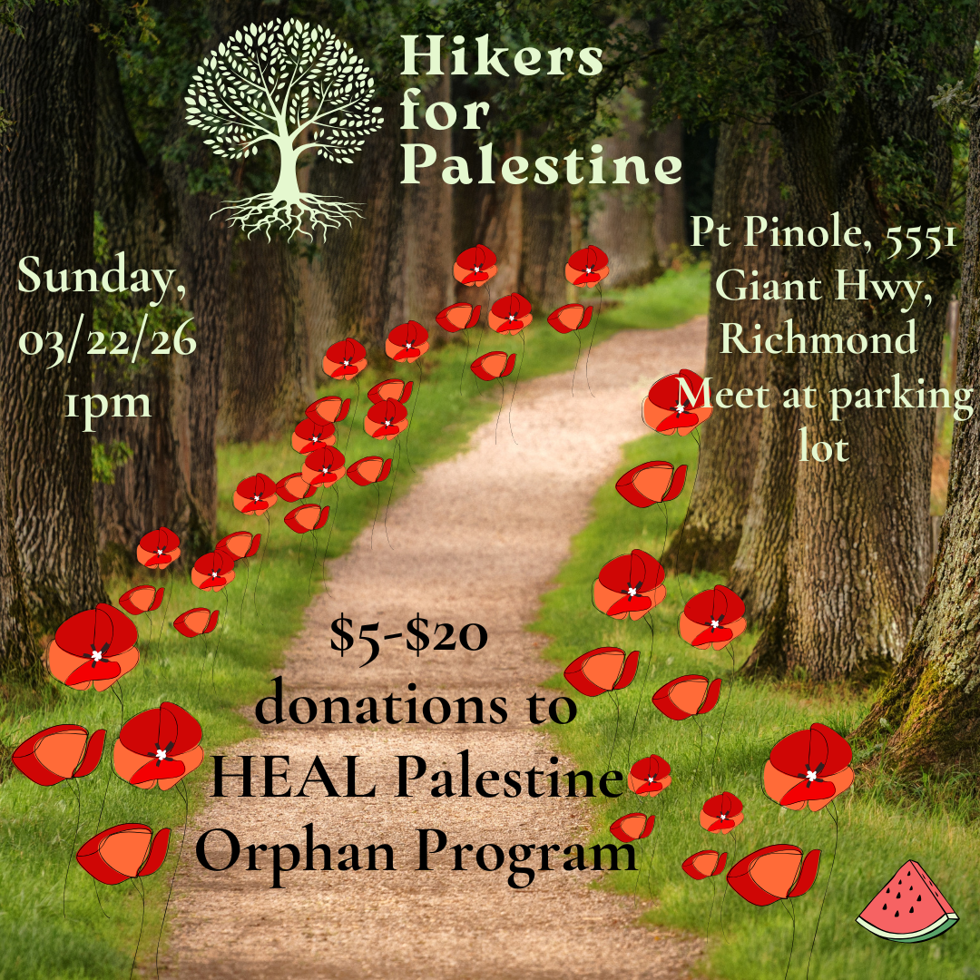 Join Hikers for Palestine this Sunday, 3/22/26, at 1pm. We’ll explore the scenic Point Pinole Regional Shoreline. Meeting at the park’s parking lot (5551 Giant Highway, Richmond), we’ll walk a 4.1-mile loop trail that takes about 1.5 to 2 hours to complete, depending on the pace. The route is easy and mostly flat, with some unpaved sections. The trail offers pockets of shade, with tree cover in some areas and open clearings in others. Since the trail is by the Bay, it can be windy.