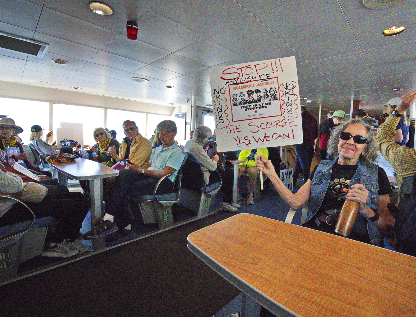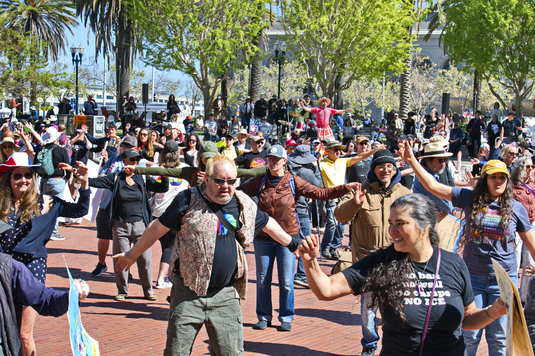 (San Francisco, March 28) - From packed ferries and BART trains they showed up. From elders to children and everyone in between, hundreds of thousands gathered at the Embarcadero and marched to rally in front of City Hall. Starting with musical exercises that included both athletic people and the wheelchair bound they began the march, led by a massive No Kings banner, down Market Street.The third No Kings Day was celebrated with marches and rallies throughout the world, a world that is horrified by a monster and sycophant party that has overthrown US democracy. A would-be tyrant President is committing aggression and killing thousands. But the New York Times, displaying its usual box checking, hollow both sidesism, questions whether the protests will have any effect.