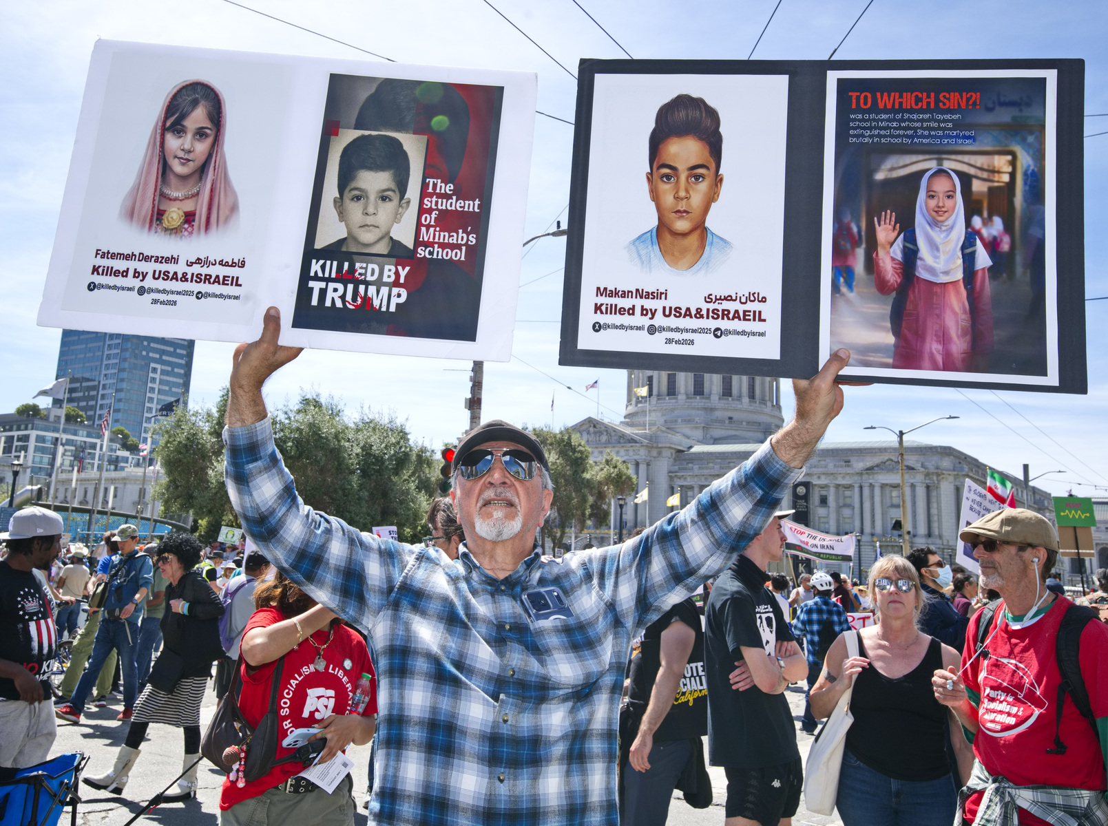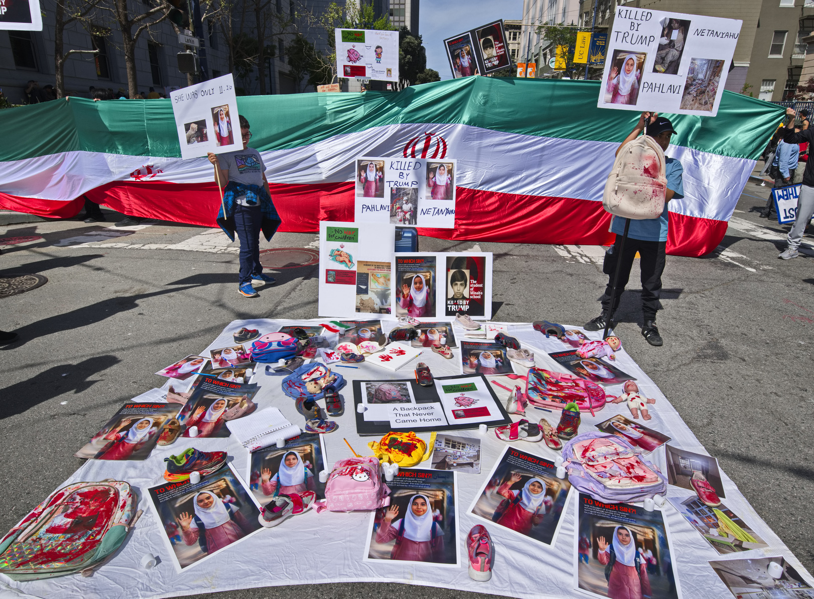 The horror of Trump's wars of aggression was illustrated by a sobering display of photos and objects of Iranian children murdered.
