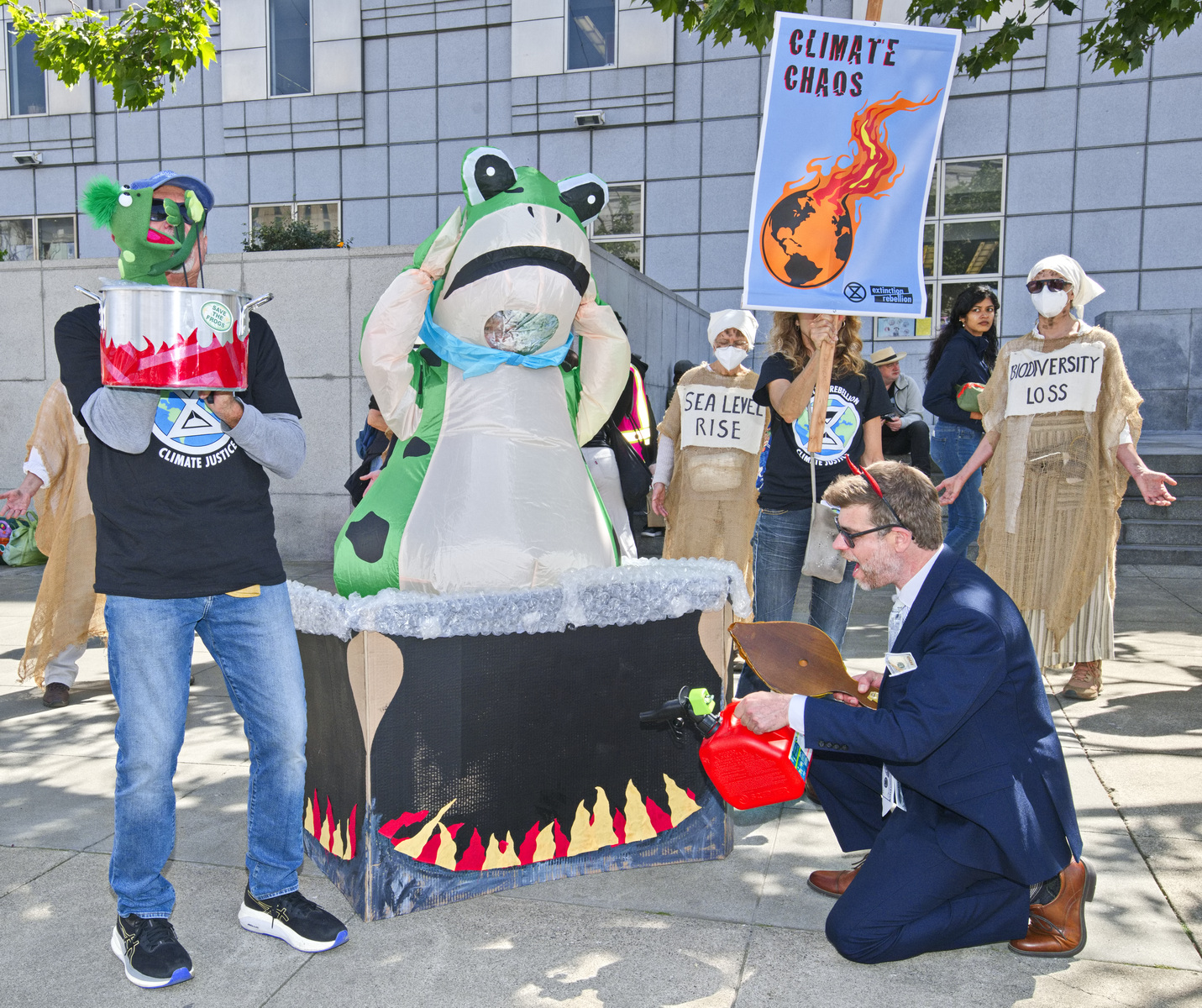 On Jones Street, Extinction Rebellion's "Lamenters" were there to remind all of the results of global warming as Trump works to eliminate wind farms, increase coal burning, open lands to oil drilling and, incredibly, seeks to reduce limits on tail pipe emissions. They performed a skit of a frog in a boiling pot with an oil "executive" fanning he flames and waving dollars.
