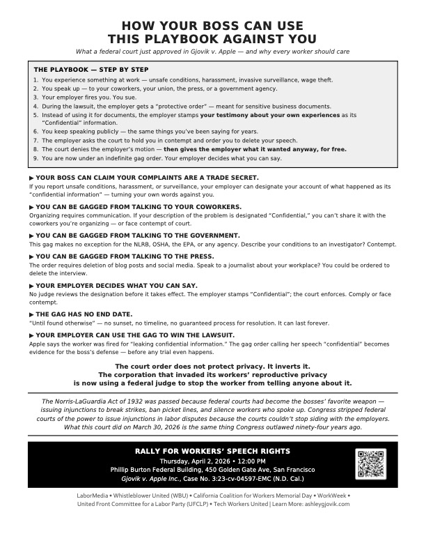 The rally is organized by Ashley Gjovik, a former Apple senior engineering program manager who was fired in 2021 after publicly reporting environmental hazards, invasive employee studies, and workplace surveillance — and who has now been ordered by a federal magistrate judge to delete her public speech and stop talking about Apple's unlawful conduct and unfair labor practices, based on Apple's unilateral claim that her own experiences, witness testimony, and complaints are Apple's "confidential business information."