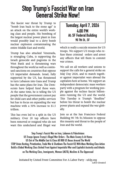 We call on all workers and unions to support the calls for a general strike on May Day 2026, and to march together against imperialist wars abroad the capitalists here at home. We support an