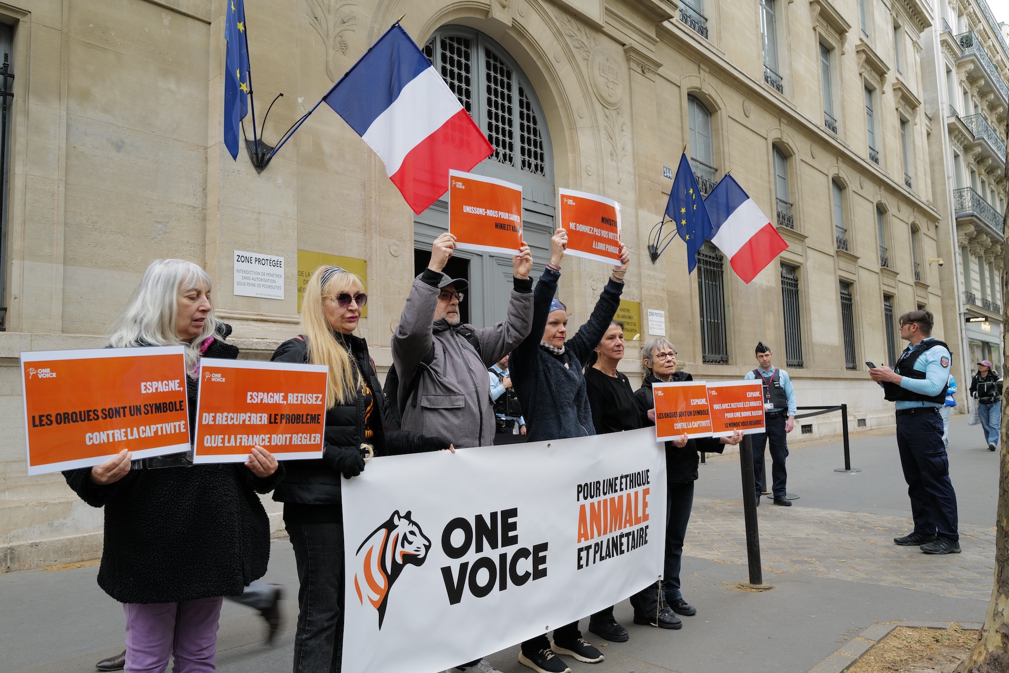 PARIS (04-14) – A pop-up protest by French human rights, animal rights, and environmental law activists, One Voice France Association for the Defense for Animals, whose motto proclaims, “Je Suis La Voix des Animaux” (I am the voice of marine animals) took place April 13 outside the Ministry of Ecology and Biodiversity and Negotiants of Climate and Nature.