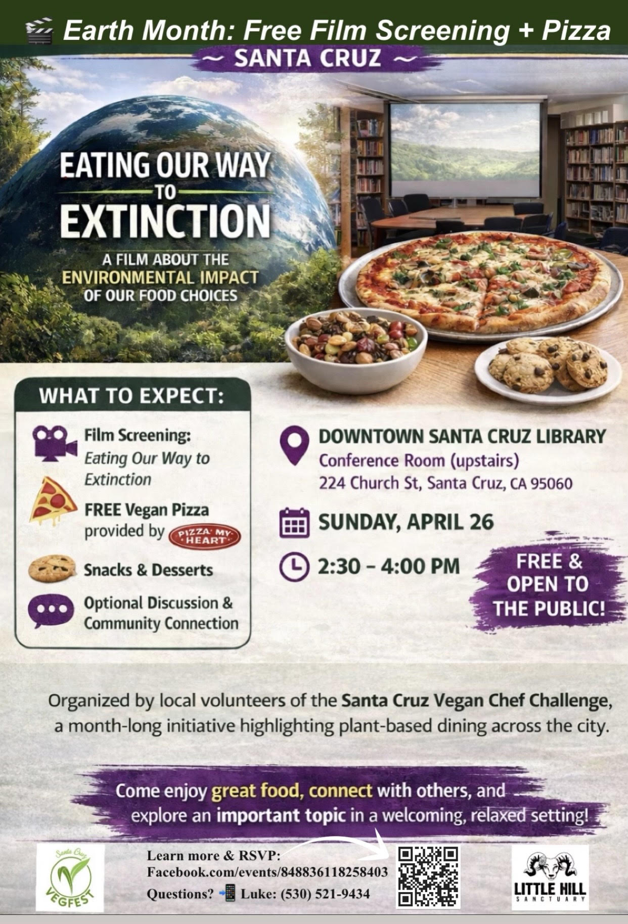 Join us for a special community event featuring a free film screening of Eating Our Way to Extinction, along with a free vegan meal and refreshments!