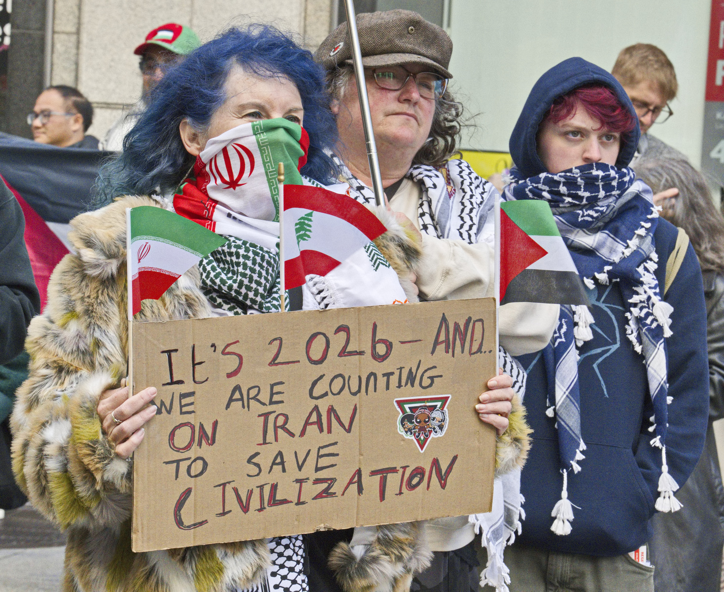 San Francisco's Israeli consulate saw a spirited protest action on April 15, the day US tax returns are due. Protesters displayed signs saying "no taxes for genocide," "sanction Israel" and "and hands off Lebanon." Many Palestinian flags and Iranian flags were there.