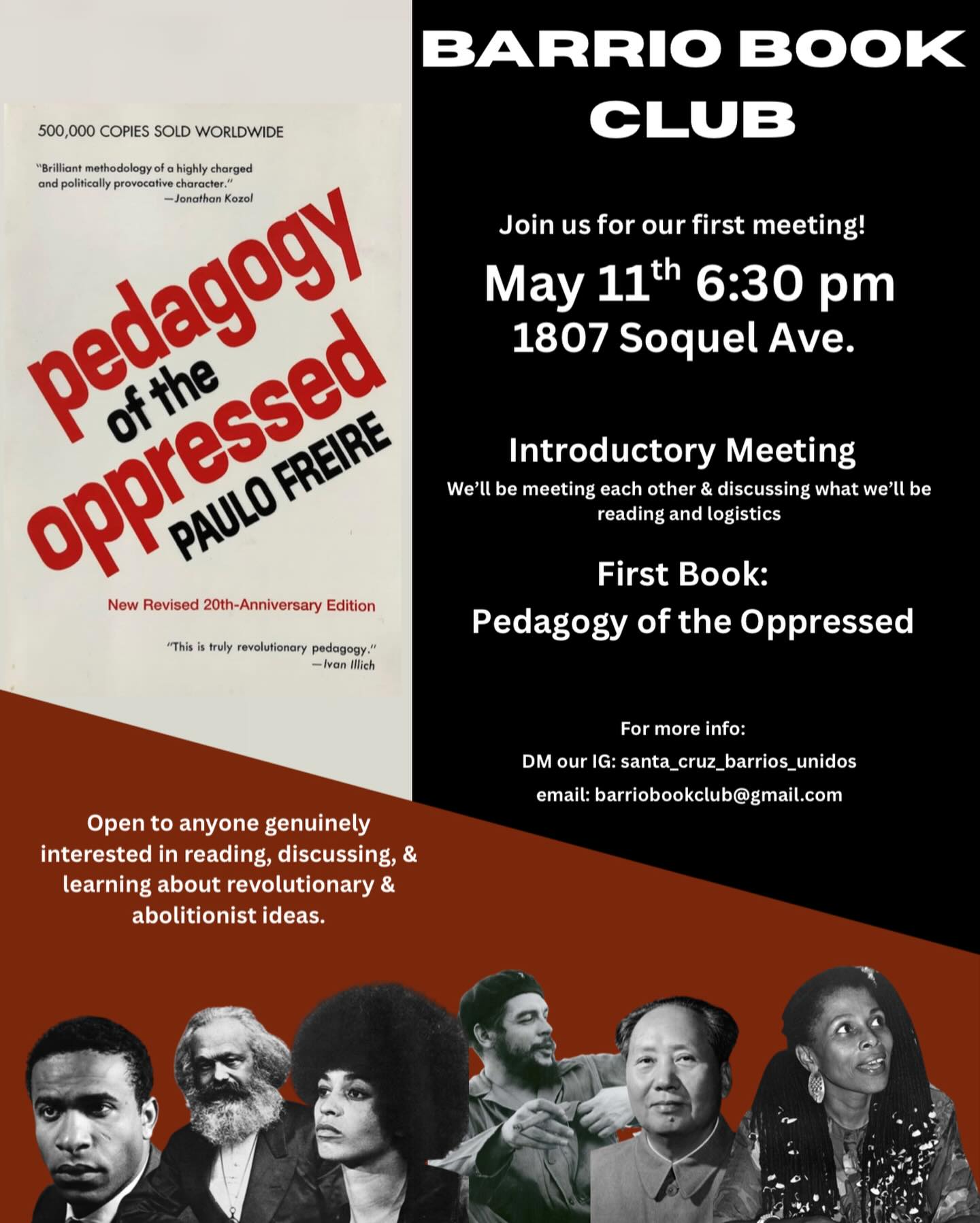 Join us for the first ever Barrio Book Club! This is a safe space for learning theory, open to anyone interested in learning about abolitionist ideas and organizing. There will be coffee and snack provided. This will take place on May 11th 630pm at 1807 Soquel Ave.