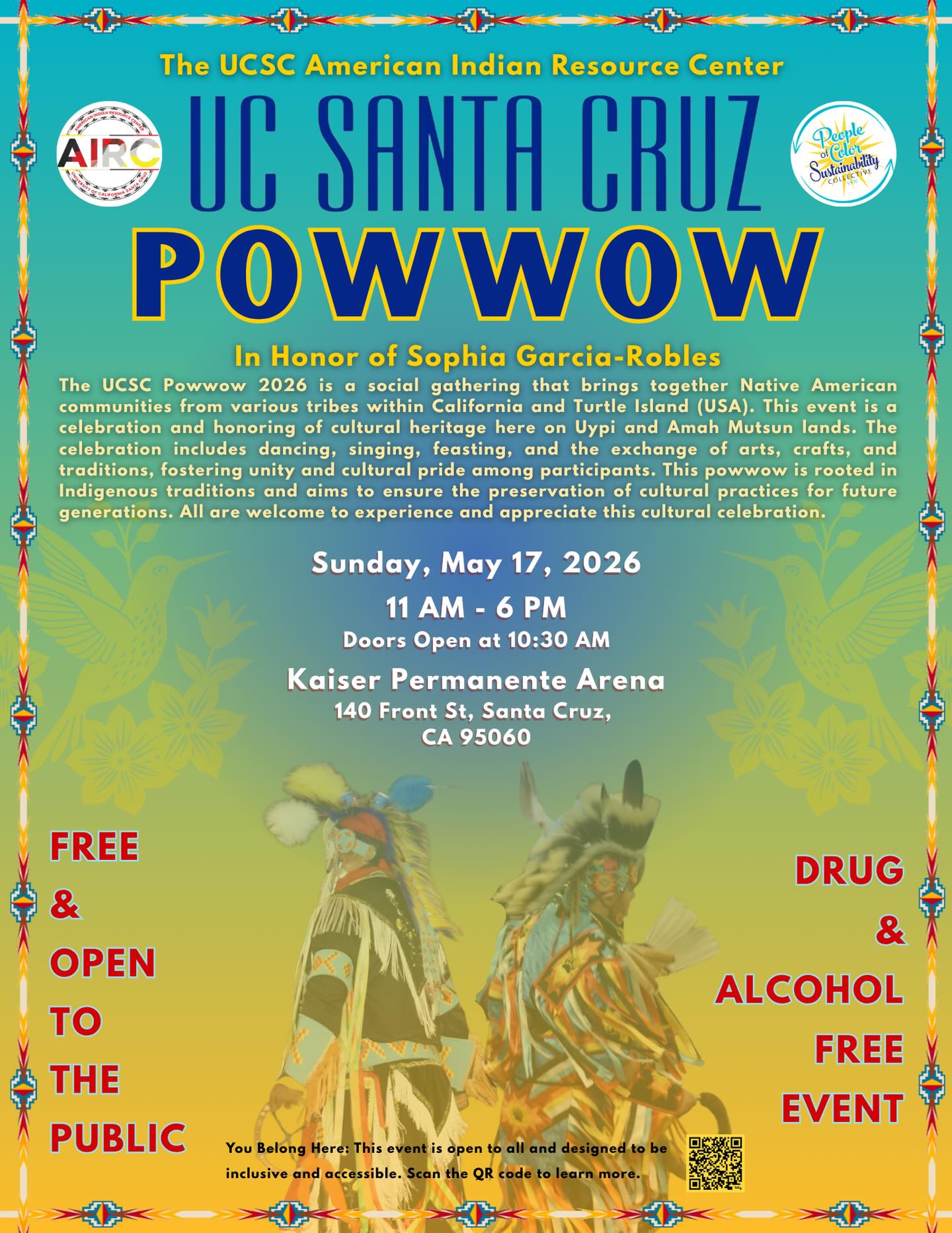 The UCSC Powwow 2026 is a social gathering that brings together Native American communities from various tribes across California and Turtle Island. This event is possible as we gather to celebrate and honor Native cultural heritage on Uypi and Amah Mutsun lands. 🌎✨