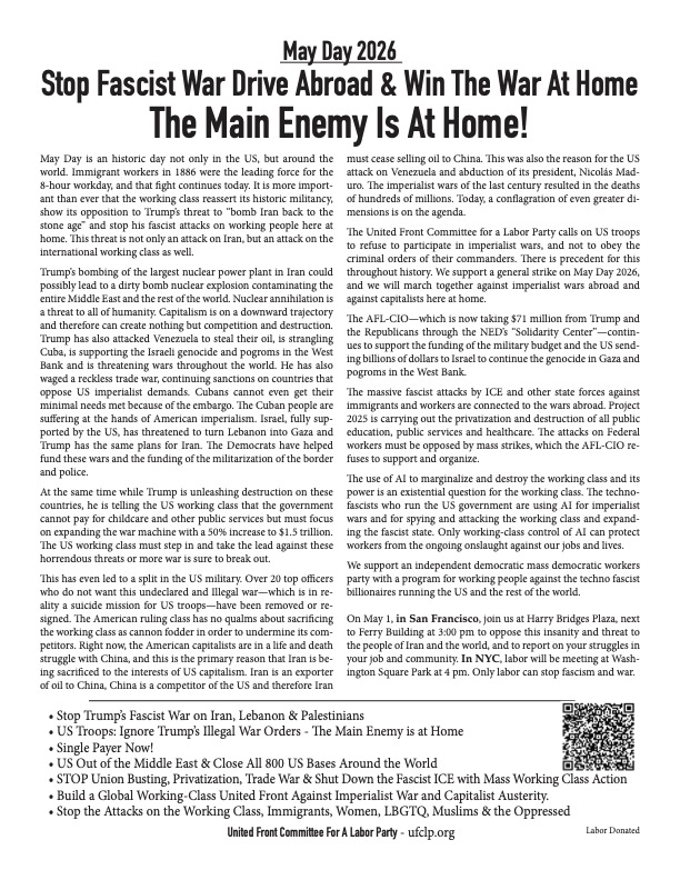 The United Front Committee for a Labor Party calls on US troops to refuse to participate in imperialist wars, and not to obey the criminal orders of their commanders. There is precedent for this throughout history. We support a general strike on May Day 2026 and we will march together against imperialist wars abroad and against capitalists here at home.